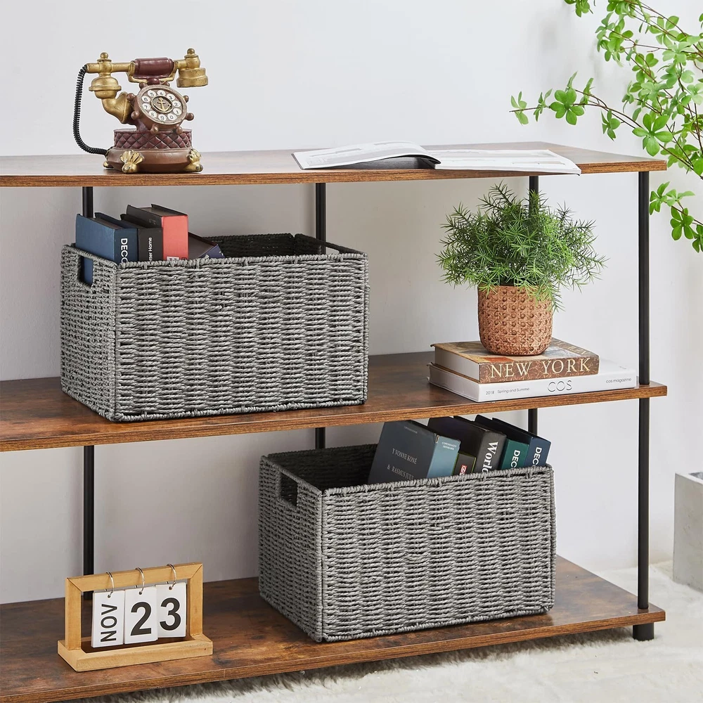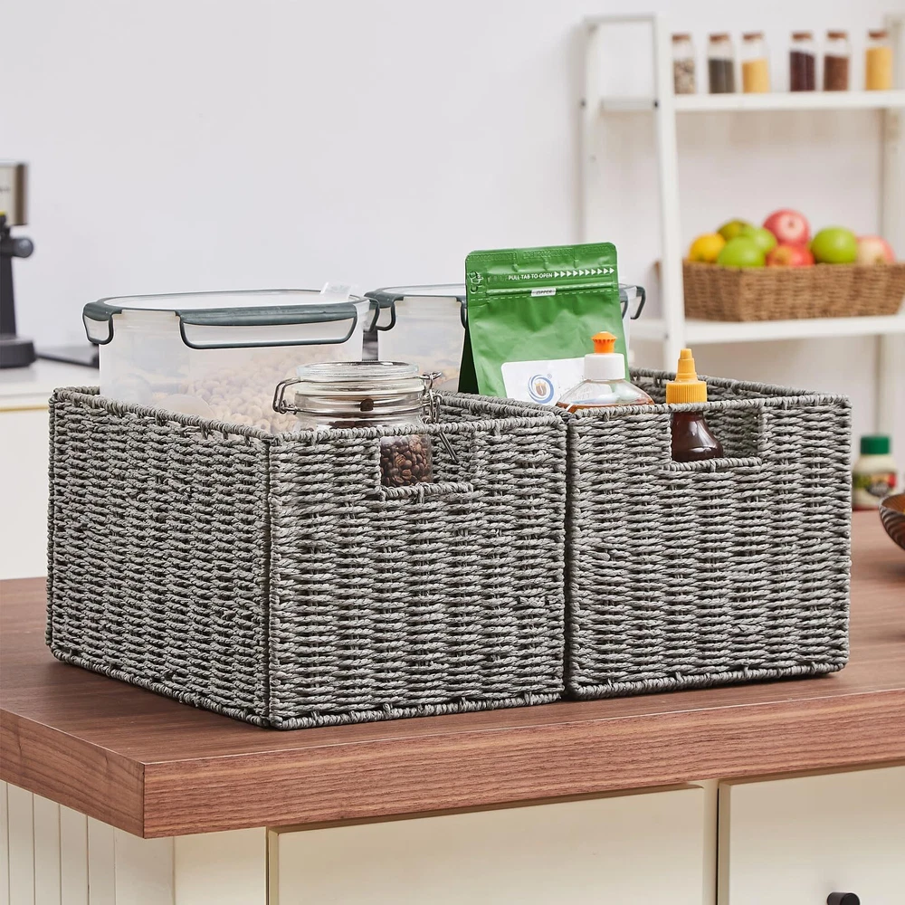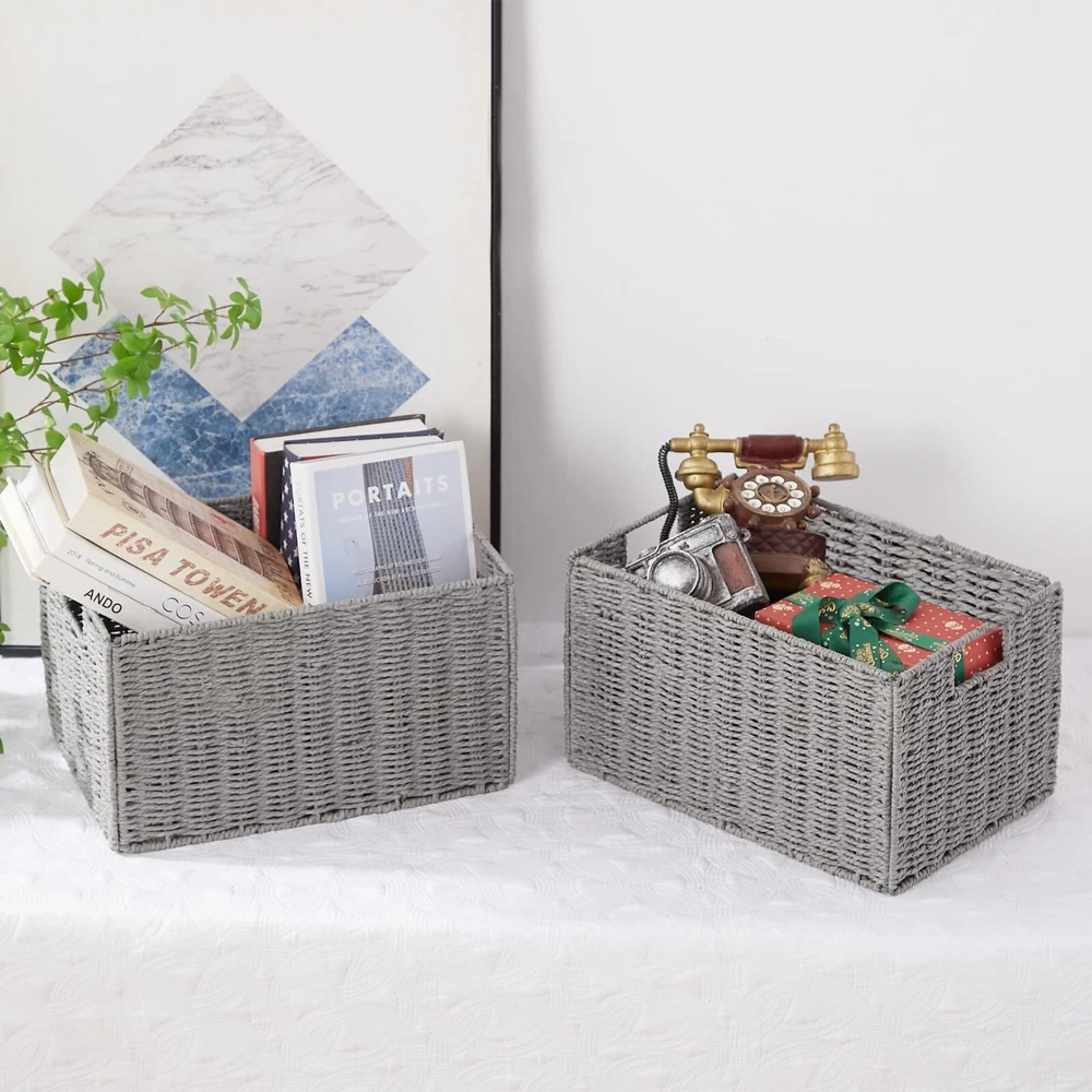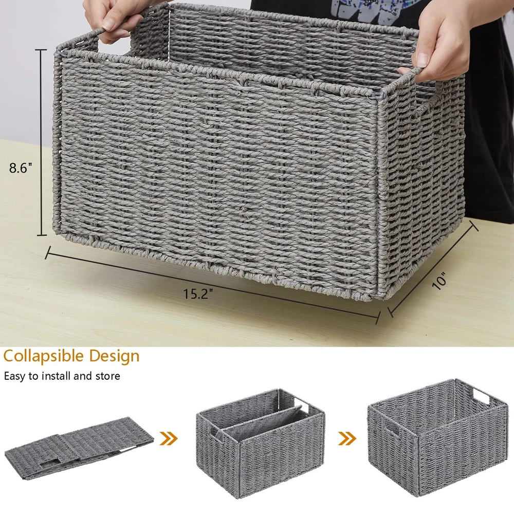 Dimensions: The storage basket measures 15.2''L x10''W x 8.6''H large baskets for storage. Size may vary within 1/4 inch due to handwoven design and manual measurement. Eco-firendly & Sturdy: 100% renewable round paper rope. Wicker baskets are woven from paper over a steel frame and the material is hazard-free. These small baskets for organizing are all handmade with natural paper custom. Collapsible Basket: You can fold the grey basket completely flat and stack them up against each other to save space when not in use. Versatile & Functional: These large storage wicker baskets can be used in your bathroom, living room, kitchen, office, pantry countertop toilet storage baskets, etc. Portable Storage Bins: Basket organizer feature easy-carry integrated handles. Versatile little rattan baskets for topper paper, keys, drinks, canned foods, snacks, hand towels, toiletries, toys, and purses. Buying with Confidence: We provide refunds and returns if there are any problems after receiving these large rectangular storage baskets for organizing.