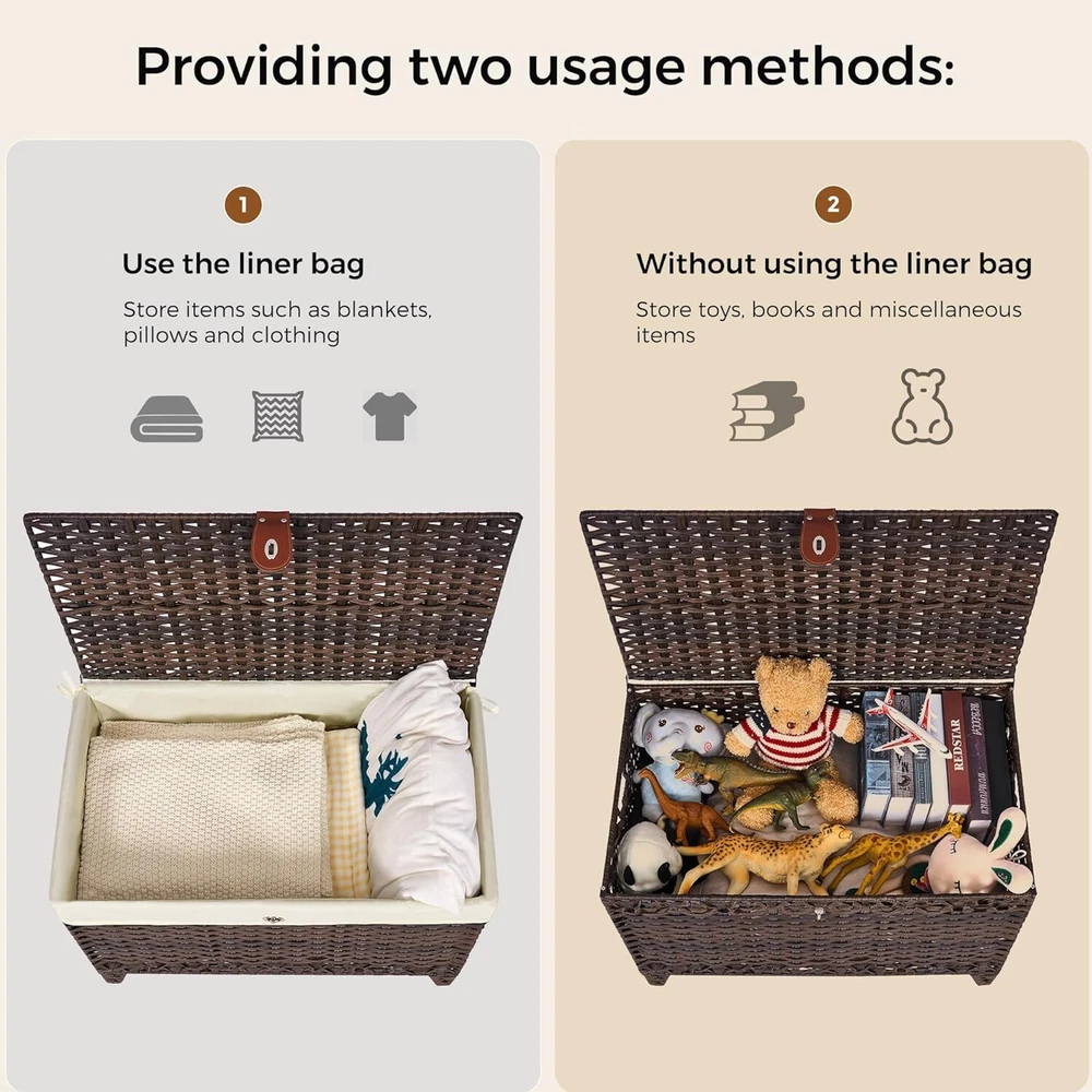 Product Description Wicker Storage Basket with Lid,Rattan Shelf Basket with Removable Liner Bag,160L Storage Bin,Storage Trunk with Heightened Feet,Storage Container for Wardrobe,Home Organizer [Convenient Lid Storage Basket] This storage basket features a user-friendly lid that easily opens with one hand, providing convenient access to clothing. Additionally, the lid with lock can block unpleasant odors, protect clothes from dust, and prevent access by children and pets. [Robust and Detachable Liner Bag] Made from robust 600D Oxford fabric, the liner bag is both durable and removable, allowing easy hand or machine washing. It securely attaches to the basket with a metal buckle, preventing slipping even when filled. [Designed with Heightened Feet] The storage trunk is designed with heightened feet ensures optimal ventilation, keeping your toys,blankets,sheets and clothes dry. [Spacious and Versatile] With a generous capacity of 42.3 gallons (160L), this ample storage bin is perfect for various purposes: alongside the sofa for pillows & blankets, in the bedroom for laundry, or in the closet for storing clothes. It can also serve as a storage trunk in a kids' room. [Conveniently Move and Foldable] Featuring cut-out handles on the sides, this blanket storage basket with a lid is effortlessly moving. Moreover, its foldable design enables easy storage when not in use. It was easy to put together becasue it comes pre assembled (you only had to screw in four screws). About Us We are a reputable seller with many years of experience selling on eBay. Our goal is to provide high-quality products and excellent customer service. Shipping Items will be shipped within 1-3 business days when we received payment. (Orders are not processed on weekends & holidays) Tracking information will be sent once item is shipped. Delivery time depends on destination and other factors Item is shipped to ebay address. Leaving correct address can minimize delay. For international shipping and shipping to Guam, Hawaii and Alaska, Please contact us before placing the order. International buyers please note: Import duties, taxes and charges are not included in the item price or shipping charges. These charges are buyer’s responsibility. We will try our best to reduce the risk of the custom duties. Local pick-up is unavailable at the moment. Contact Us We reply any email messages within 1 business / working days(off-duty at weekend). If you do not get a response from us, then please check your junk or spam mailbox. Our Business hours: Mon-Fri 9:00-18:00, UTC/GMT +8 hours. Please contact us either by clicking "contact seller" in the "purchase history" section or simply click "ask a question" at the bottom of this page. If you are unsatisfied with our item or service, please contact us before leaving any feedback. We are committed to resolve all issues in a friendly and satisfactory manner.