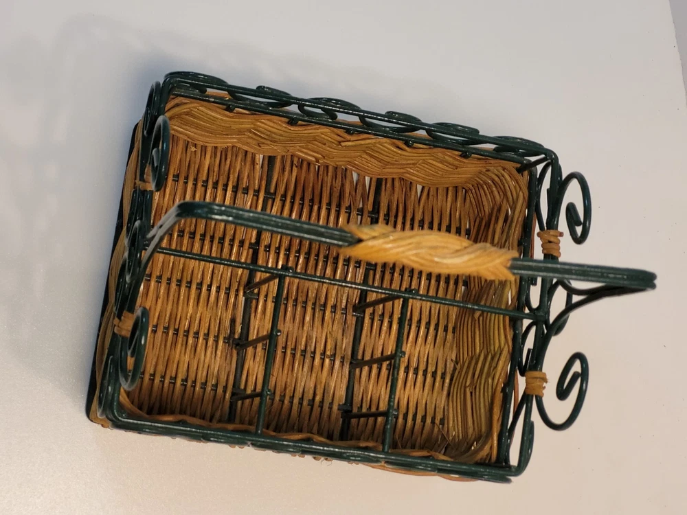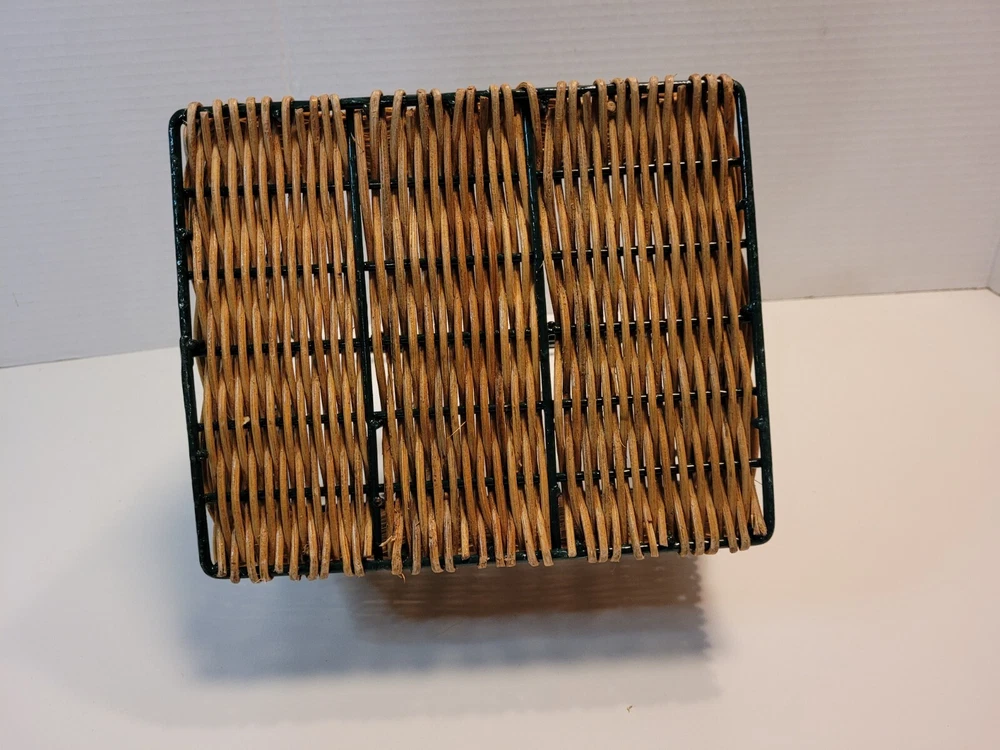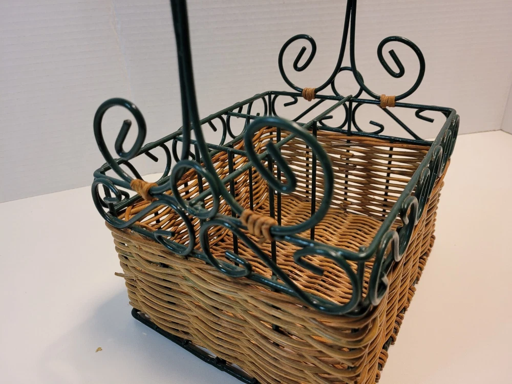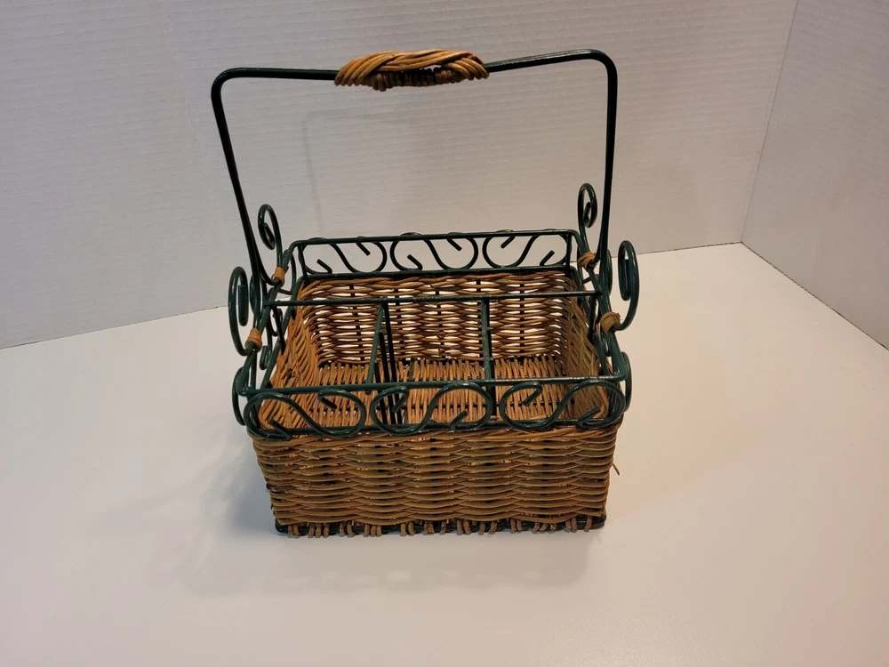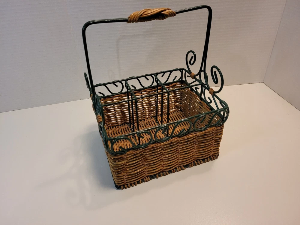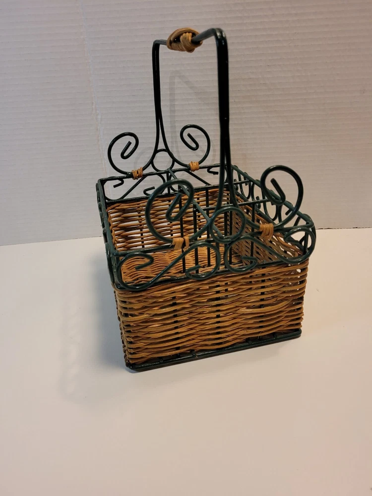 Wicker & Wire Basket for Flatware and Napkins. Silverware Caddy Utensil Organizer. With a handle for carrying, making buffets and picnic dining easy. Please see the photos as they are part of the description. Flatware and napkins are not included. All measurements are approximate. 452g02s2