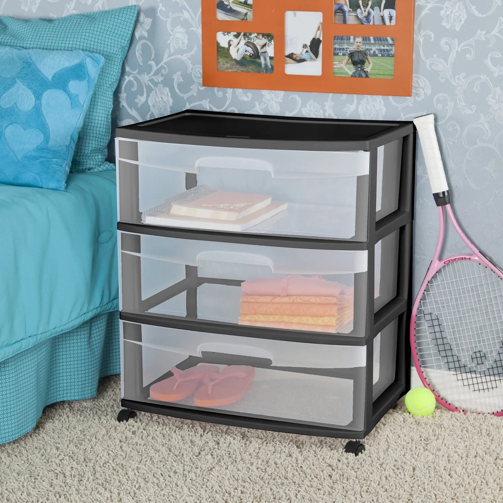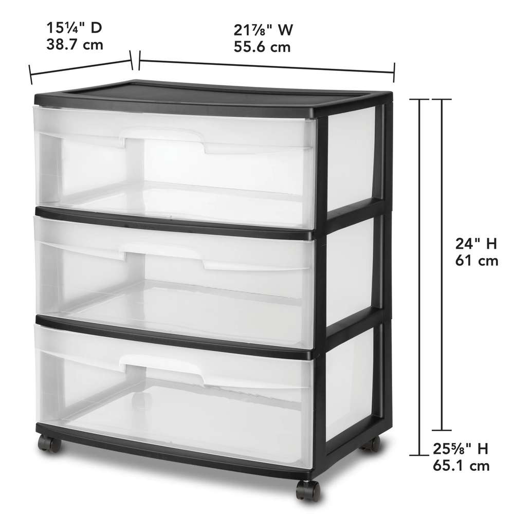 The Sterilite 3 Drawer Wide Cart offers a practical and versatile storage solution for any room of the home! Organize a variety of lightweight household items where they are most frequently used - in the bedroom, kitchen / pantry, bathroom, craft room, nursery or dorm room. It can even double as a nightstand, dresser or way to make efficient use of closet space. Neatly store anything from clothing, accessories, and towels to craft supplies, health and beauty items, toys, and more. The drawer design features an integrated handle for easy opening and is clear, allowing contents to be easily identified, while keeping them contained. The drawer stop feature prevents drawers from being removed accidentally. When storing items away, be mindful of the weight in each drawer and don't overload. Add the casters to create a rolling storage option, and easily move the Drawer Cart wherever it is needed. It's easy to get organized and keep your living spaces clutter-free with the 3 Drawer Wide Cart! The overall assembled dimensions of this item are 15 1/4" D x 21 7/8" W x 25 5/8" H with casters. Sterilite Wide 3 Drawer Cart, Clear Plastic Storage Drawers, Wheels Included, Black Outside Dimensions: 15 1/4" x 21 7/8" x 24" Interior Dimensions at bottom of drawer: 19 1/8" x 13 1/4" x 7" Assembled Cart Height, with Casters: 25 5/8" Multi-purpose and versatile storage option for lightweight storage needs in any room of the home Clear drawers allow contents to be easily identified Easy pull out handles with drawer stops to prevent drawers from being removed accidentally Casters are included to create a portable storage solution BPA-free and phthalate-free