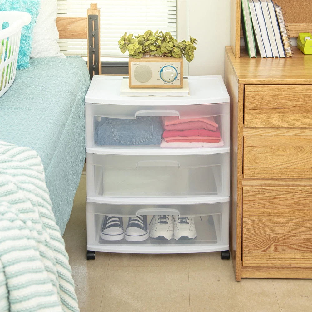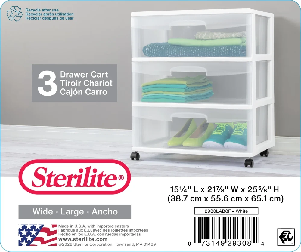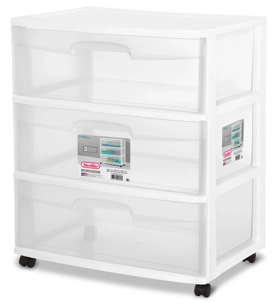 The Sterilite 3 Drawer Wide Cart offers a practical and versatile storage solution for any room of the home! Organize a variety of household items where they are most frequently used - in the bedroom, kitchen / pantry, bathroom, craft room, nursery or dorm room. It can even double as a nightstand, dresser or way to make efficient use of closet space. Neatly store anything from clothing, accessories, and towels to craft supplies, health and beauty items, toys, and more. The drawer design features an integrated handle for easy opening and is clear, allowing contents to be easily identified, while keeping them contained. The drawer stop feature prevents drawers from being removed accidentally. Add the casters to create a rolling storage option, and easily move the Drawer Cart wherever it is needed. It's easy to get organized and keep your living spaces clutter-free with the 3 Drawer Wide Cart! The overall assembled dimensions of this item are 15 1/4" D x 21 7/8" W x 24" H. Outside Dimensions: 15 1/4" x 21 7/8" x 24" Single unit option White Interior Dimensions at bottom of drawer: 19 1/8" x 13 1/4" x 7" Assembled Cart Height, with Casters: 25 5/8" Multi-purpose and versatile storage option for any room of the home Clear drawers allow contents to be easily identified Easy pull out handles with drawer stops to prevent drawers from being removed accidentally Casters are included to create a portable storage solution Weight: 11 lb. / 4.99 kg Cube: 5 cu ft. / 0.142 cu m