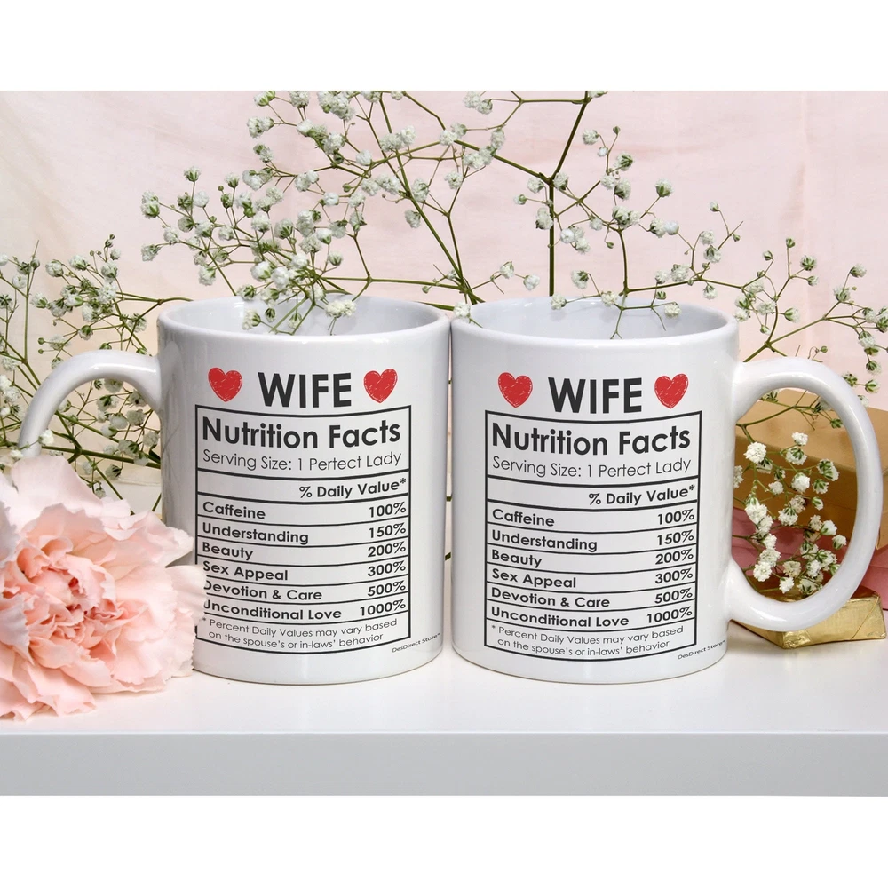 Wife Nutrition Facts Valentine Gift From Husband Family Anniversary Coffee Mug Product Details.. This high quality 11oz. ceramic white mug has a premium hard coat that provides crisp and vibrant color reproduction sure to last for years. Perfect for all hot & cold beverages. The highest quality printing possible is used. It will never fade no matter how many times you wash it. Material: 100% Ceramic. Print both sides. Dishwasher and Microwave Safe. High Gloss + Premium White Finish. Printed in the U.S.A. Personalized & Custom. We support personalized and custom mug to add custom, when placing an order, you can add notes to the "order note" in shipping address section. Also you can contact us directly via message. Shipping Info. Ready to ship in 1 to 2 business days, All products are made-to-order and proudly printed in the United States. Shipped by USPS and DHL, You will receive your order in 5-7 days. Replace & Refund. All products are defective during shipping broken, chipped will be replaced free of charge. You are not satisfied with the product, we will refund 100% money to you. If any other issues arise, please do not hesitate to message, we would be more than happy to assist you.