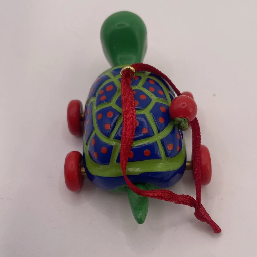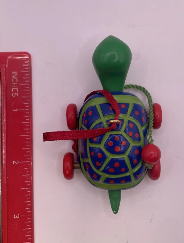 This Hallmark Keepsake Ornament is a must-have for any fan of The Wiggles. It features a cute and cuddly green turtle, made of wood and crafted with care in 2001. The turtle is an original, licensed reproduction and is sure to bring joy to anyone who sees it. Add this charming ornament to your collection today! No box.