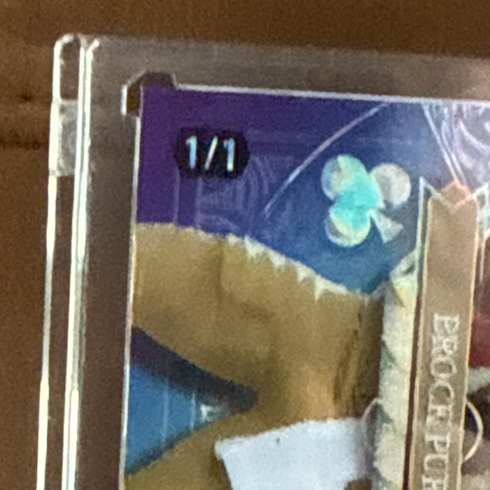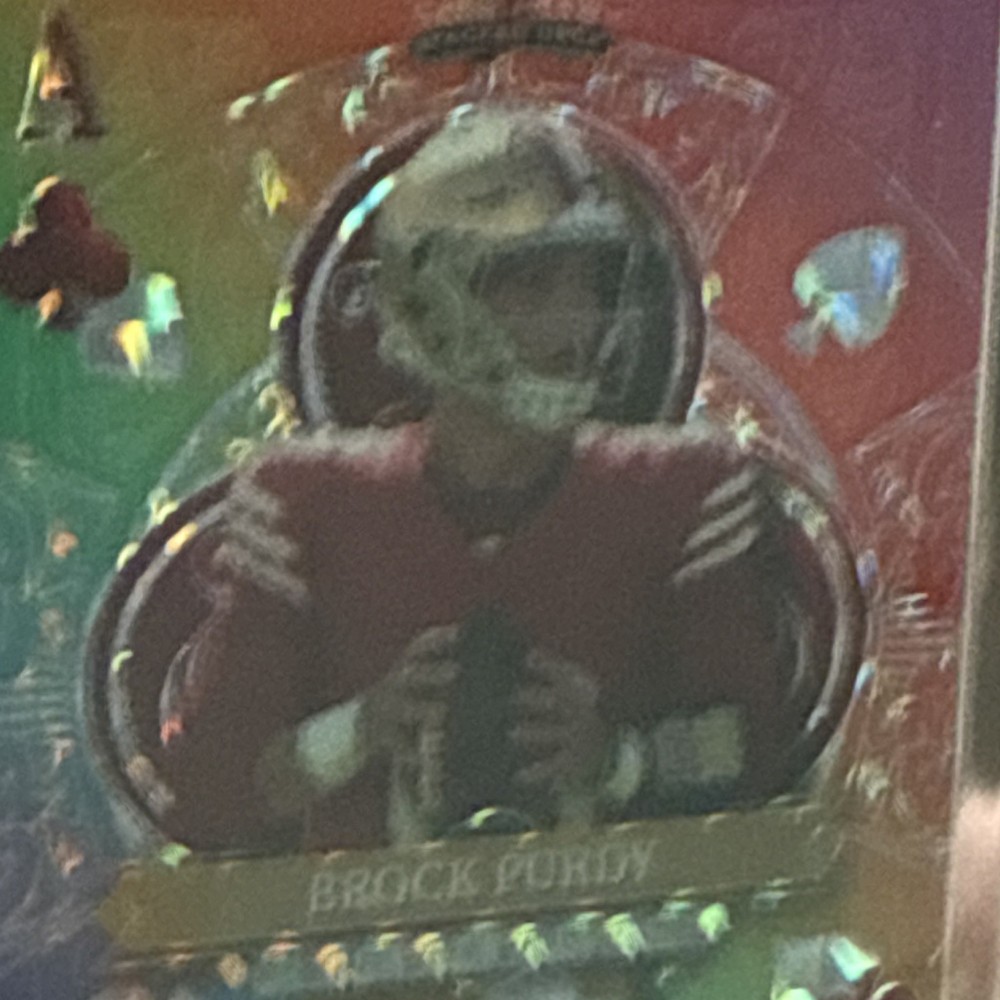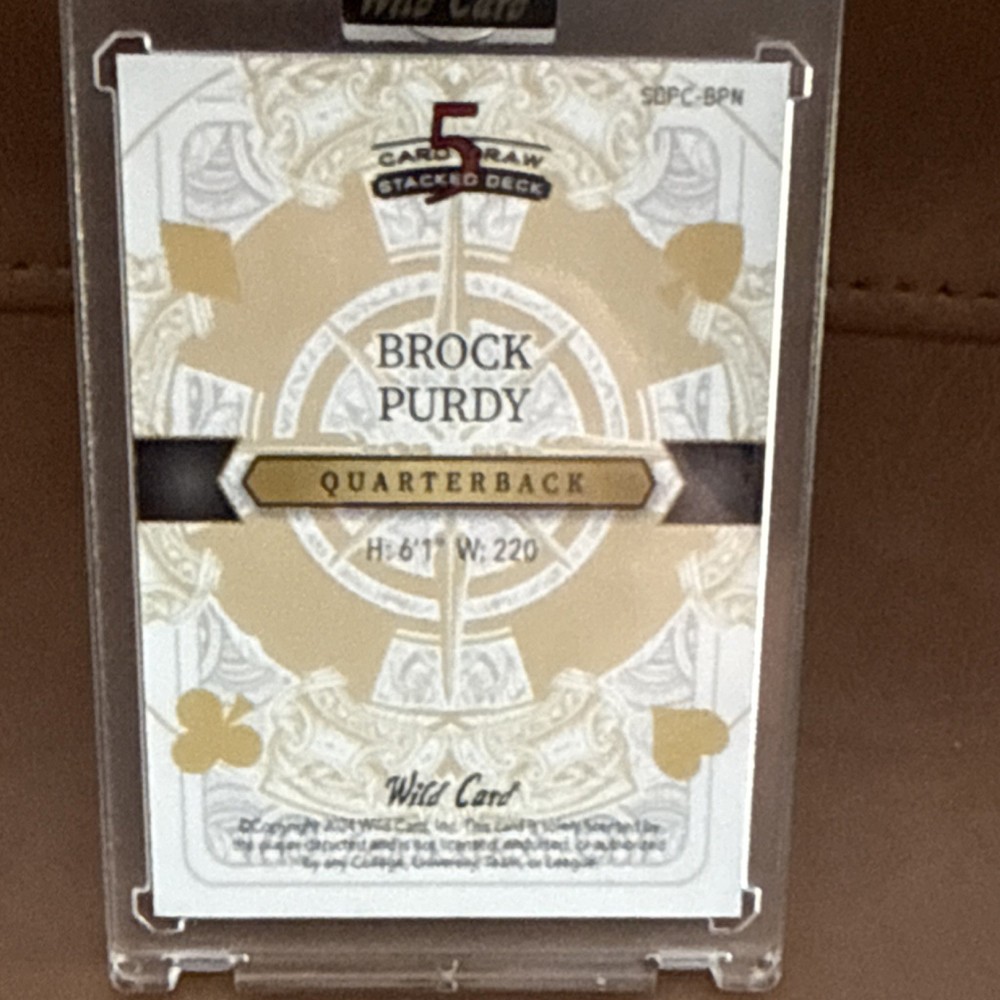 The Wild Card 5 Card Draw Stacked Deck Brock Purdy Classic Holo Foil 1/1 Football trading card is a highly sought-after collectible featuring Brock Purdy, a popular football player. This one of a kind card is made of high-quality card stock and is serial numbered as 1 out of 1, making it a rare and valuable addition to any sports trading card collection. With its unique design and limited availability, this card is sure to be a prized possession for any fan or collector of football memorabilia.