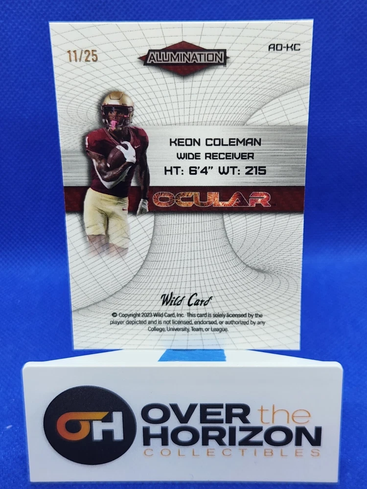 The 2023 Wild Card Ocular Keon Coleman trading card is a limited edition sports trading card featuring the rookie player Keon Coleman from the Buffalo Bills, Michigan State Spartans, and Florida State Seminoles. This card is part of the 2023 Wild Card set, specifically the Purple parallel variety with a print run of only 25 copies. It includes features such as being serial numbered, having a hologram, and being a short print, making it a sought-after collectors' item for fans of football trading cards.