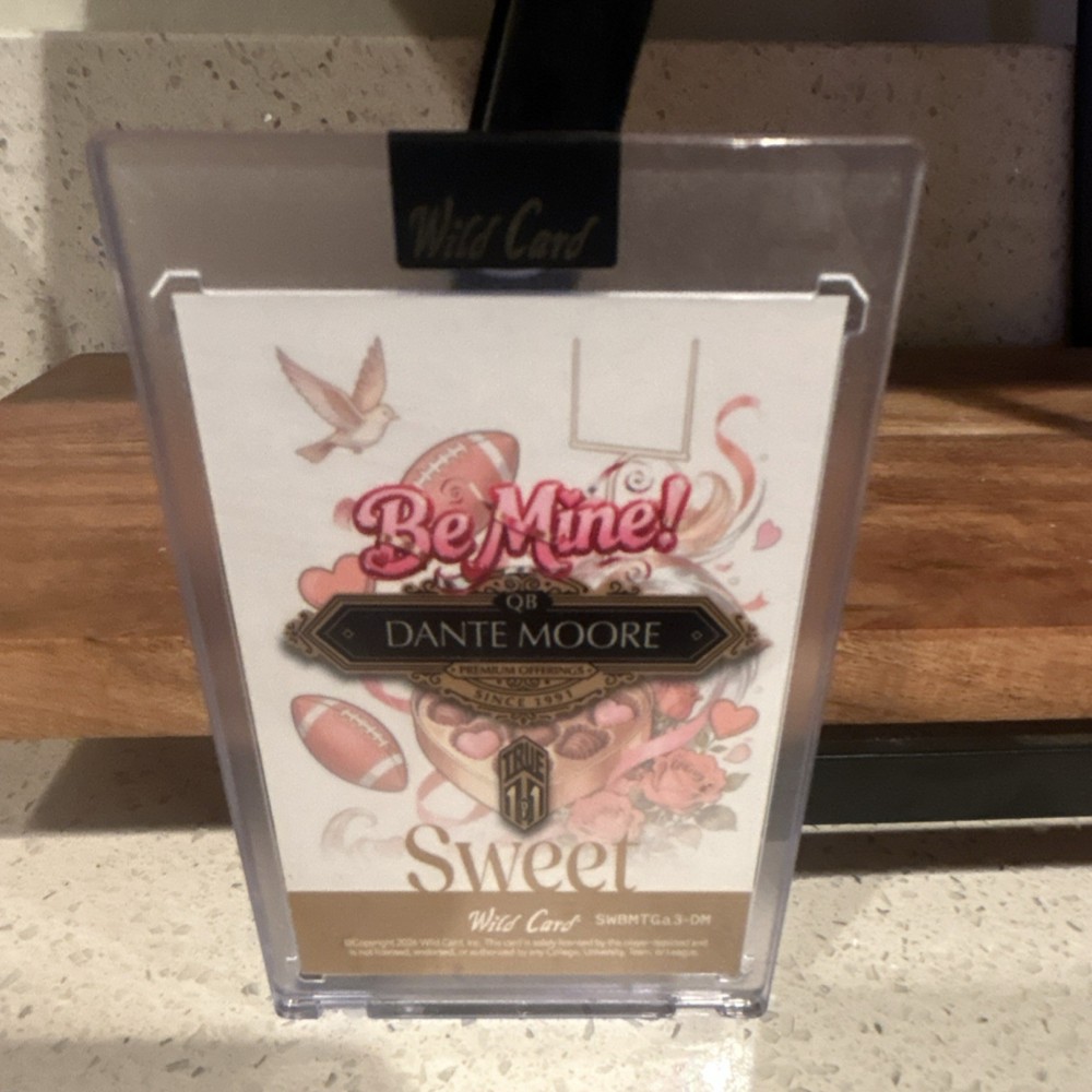 The Wild Card Sweet Dante Moore One of One Rookie Be Mine trading card is a highly sought-after collectible featuring the football player Dante Moore. Manufactured in 2023, this card is a limited edition print run of only 1, making it a rare and valuable addition to any sports trading card collection. With its original design and unique features, this card is a must-have for fans of football and trading card enthusiasts alike.