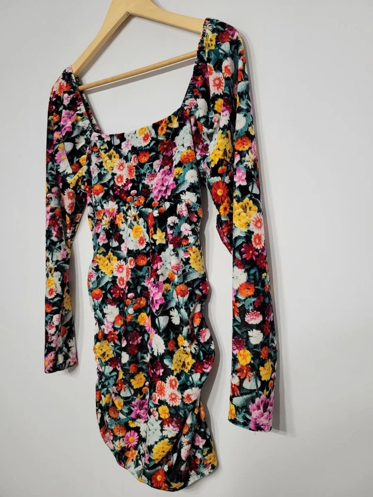 Wild Fable Velvet Floral Ruched Off Shoulder Dress Women's Medium Polyester Spandex Stretchy material Pre-owned great condition 30 inches long 15 inches across E1F