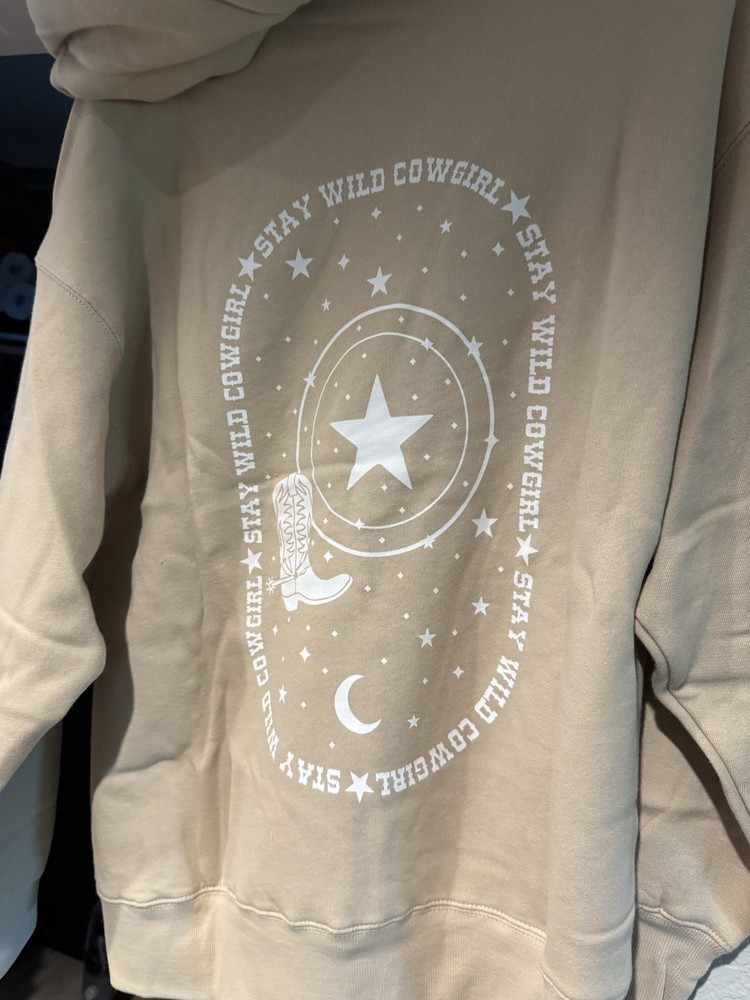 The Wild Fable Women's Stay Wild Cowgirl Sweatshirt in size small is a stylish and comfortable pullover designed for active women. Featuring a beige color and a cowgirl theme, this sweatshirt is perfect for casual outings or workout sessions. Made by the popular brand Wild Fable, this sweatshirt is a trendy addition to any wardrobe, offering both style and comfort for everyday wear.