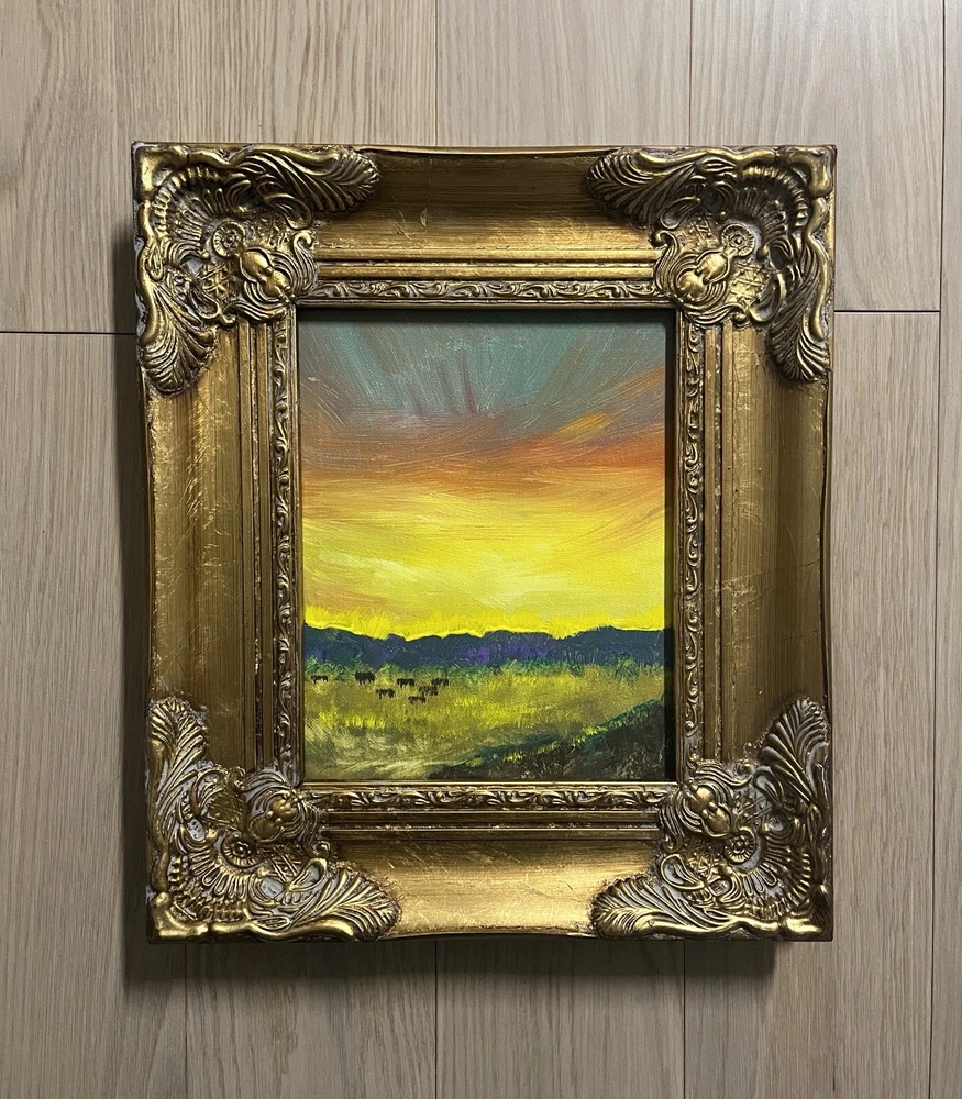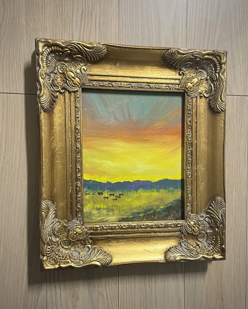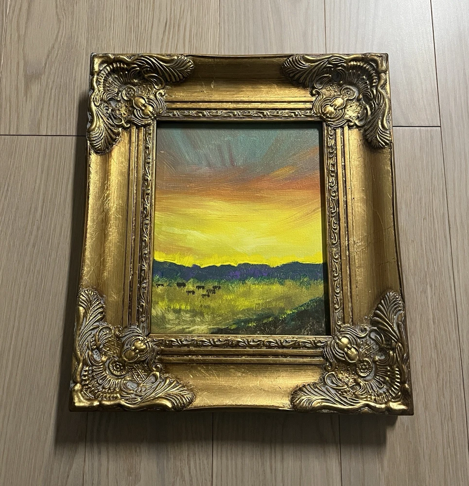 “Twilight on the Frontier” As the golden sun dips toward the horizon, the vast plains of the Wild West glow with hues of amber and violet. Distant mountains, their silhouettes softened by the evening haze, stand as silent sentinels watching over the land. Below, a herd of bison grazes undisturbed, their dark forms blending into the lush, rolling grasses that ripple with the fading light. This is a moment of peace—a brief pause in the rugged world of cowboys, pioneers, and uncharted wilderness—where nature reigns supreme, untouched and eternal. FRAME: framed MEDIUM: Acrylic paint premium artist quality Art work is signed by Impressionist from US MD Artist painter Max Kravt. MFA and Cumberland art member. Shipping via USPS tracked and insured. Shipping free for buyers in the US. Please check my other artworks and paintings in the seller account -> other items for sale. This listing is for original artwork landscape oil painting, not a print or copy of any kind. Max