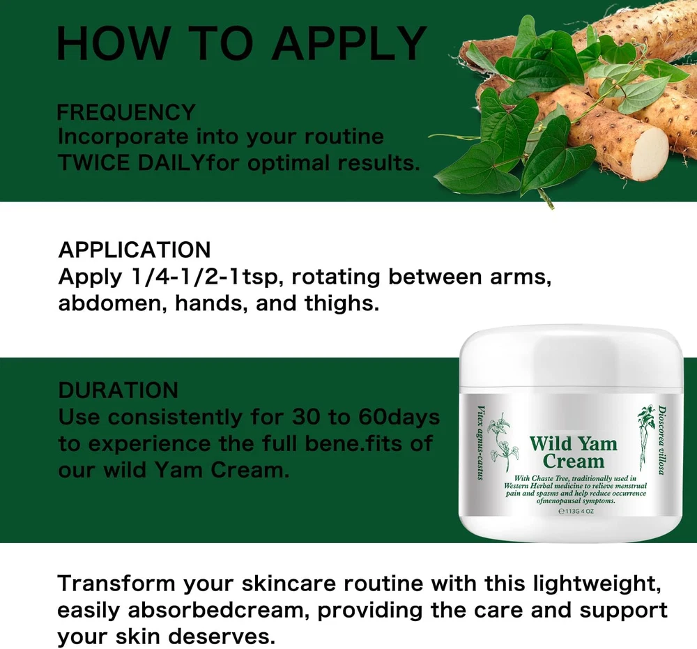 Product Overview : A natural and organic topical cream using Wild Yam for symptom relief during internal changes and overall balance. Ingredient Features Natural and Organic : Composed of natural plant extracts, safe for body use, maintaining balance and enhancing circulation. Dry and not Greasy : Hydrates skin deeply, absorbs quickly, leaving no residue and not clogging pores. Hydrates and Moisturizes : Increases skin moisture, plumps appearance, with quick absorption and no greasiness or stickiness. Suitable Skin Types : Dermatologist-friendly, hypoallergenic, fragrance-free, suitable for all skin types, free of parabens, synthetic fragrances, and gluten, safe for acne-prone skin. Product Specifications : Package Dimensions: 2.8 x 2.8 x 2.44 inches; 7.05 ounces. Date First Available: March 8, 2024. Manufacturer: [Manufacturer Name]. ASIN: B0CXJ97X7K. Best Sellers Rank: #10,874 in Health & Household (See Top 100 in Health & Household), #31 in Menopause Medications & Treatments.