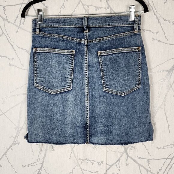 Wilfred Free Medium Wash Stretch Denim Raw Hem Tanit Skirt style tags: grunge, festival, distressed, Y2K Women's 8 Waist: 14.5" Length: 15.5" (front); 17" (back) Good used condition: no rips, marks or stains