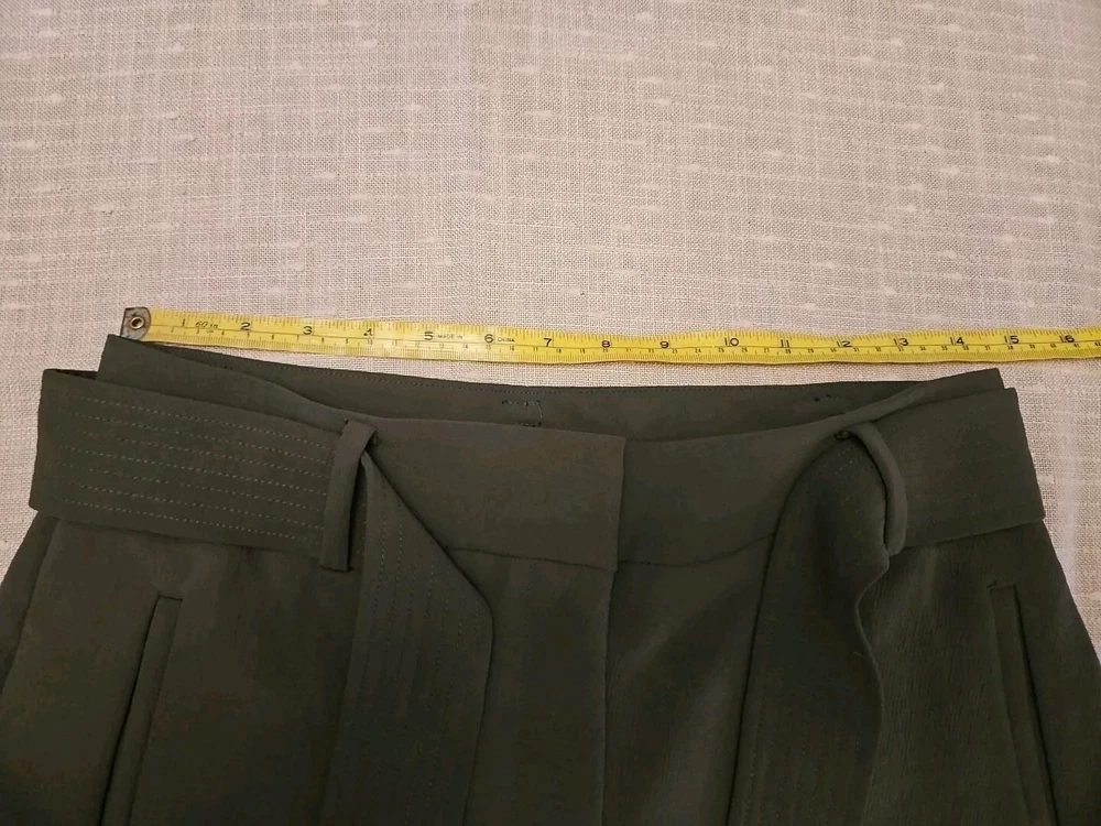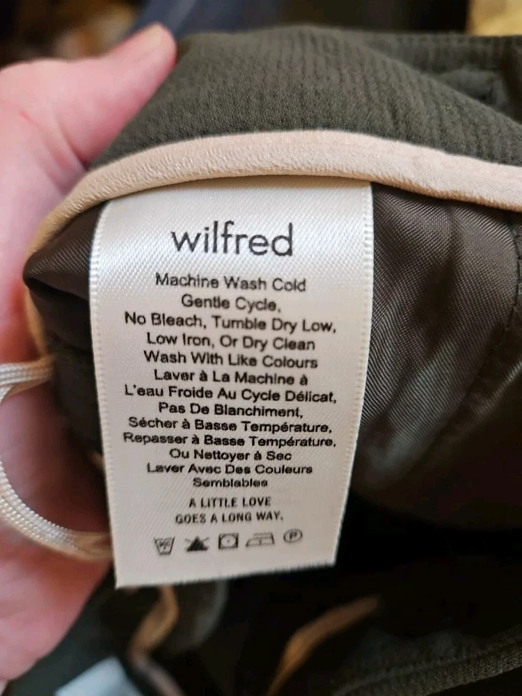 Wilfred pants up front with tie waist green crepe like trousers in size 10 straight leg in good preowned condition. Color may vary from pictures. Measurements are approximate as seen in pictures. International shipping could have extra taxes and or fees. Please let me know if you have any questions.