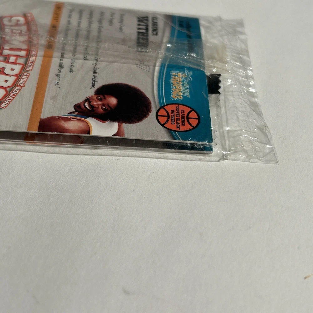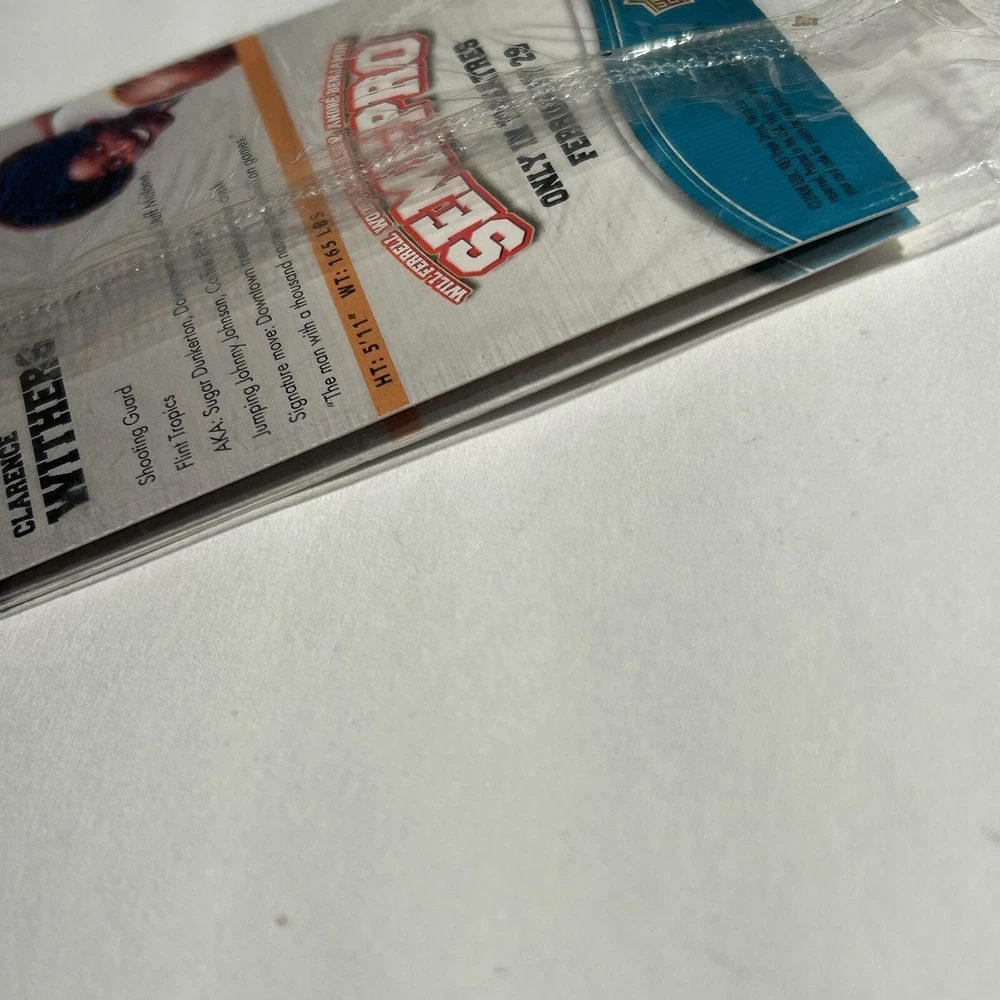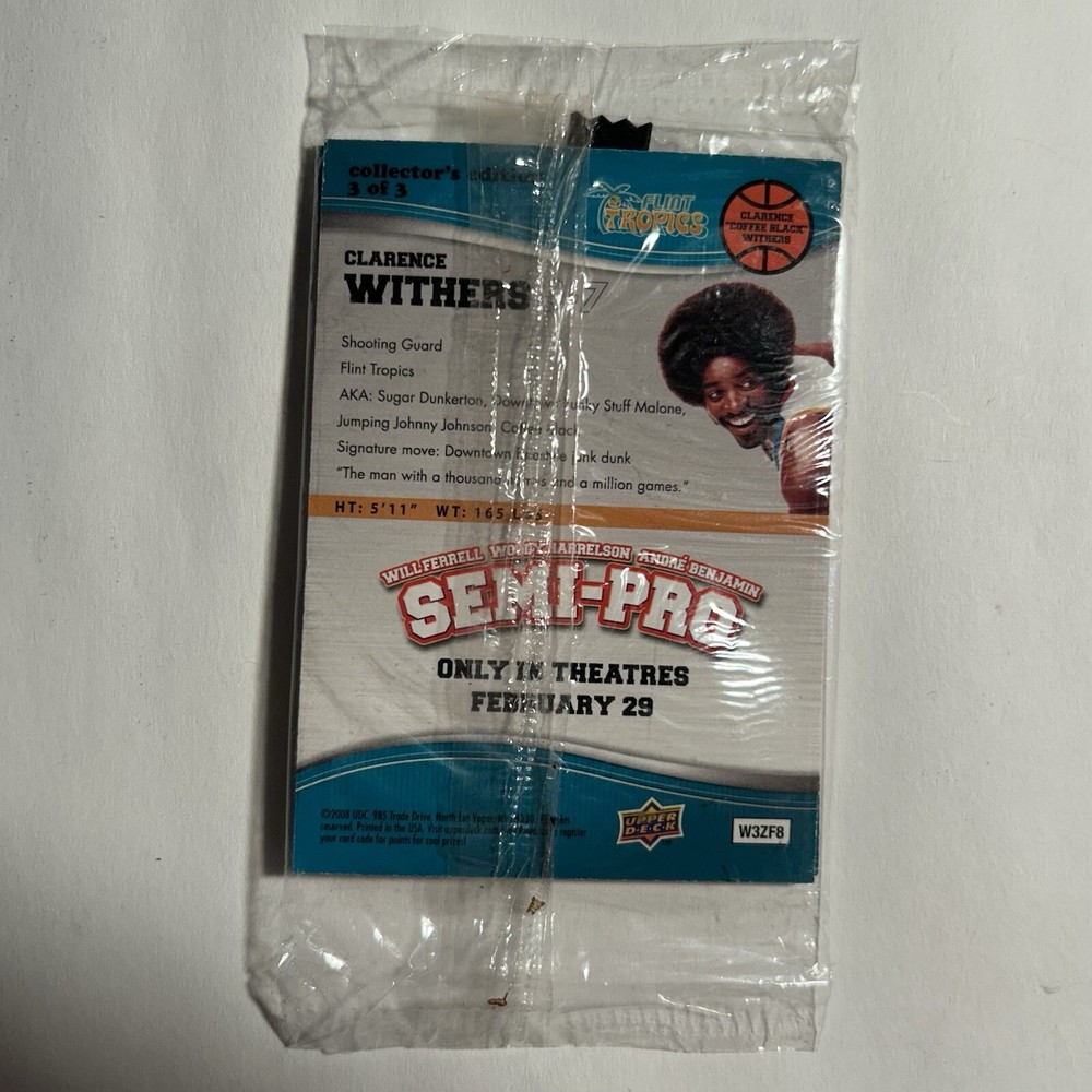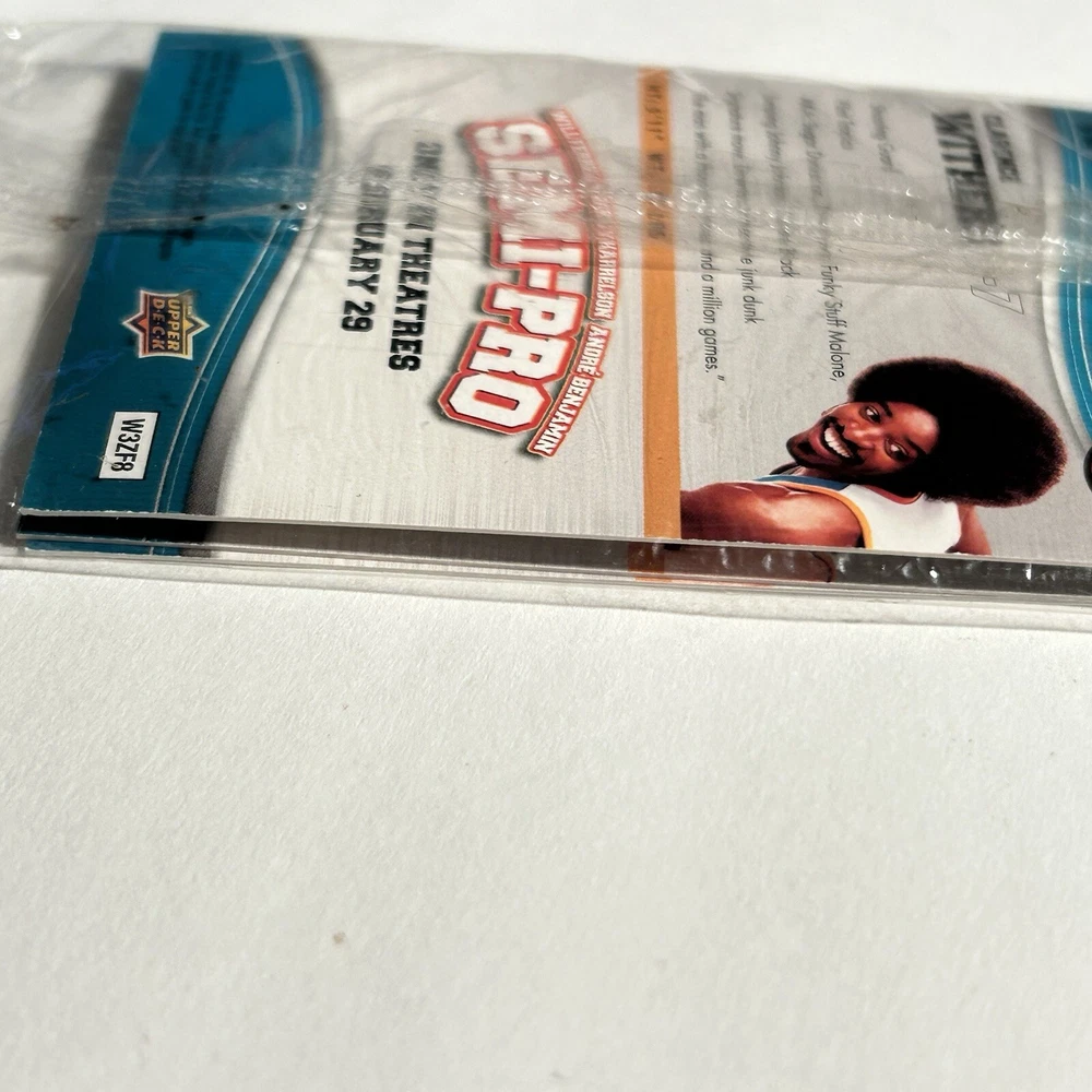 Staining is on plastic wrap, not cards. Buy this sealed pack for a great chance at grading them to increase value, PSA 10 Will Ferrell card is currently listed on ebay for $2,999 with 35 watchers. I can't promise you will get PSA 10, but I can assure you will get a completely sealed brand new pack. View images for cards condition. (Combined shipping on all items. Please message me if you have any questions.) Dive into the world of Semi-Pro with this exclusive 2008-09 Upper Deck basketball card set featuring the vibrant ensemble from the popular movie. This limited edition collection showcases the talents of Will Ferrell alongside stars like Woody Harrelson and Andre 3000, captured in a sports-themed cinematic experience that brings a touch of hilarity to the court. Each card is a tribute to the Flint Tropics, crafted with care in the United States, and comes in standard size. Among the set's gems, you'll find serial numbered inserts, rookies, and exclusive promo cards that celebrate the American Basketball Association (ABA) with a dash of celebrity flair. This collection is an original print run, unopened and sealed, ready to be a prized possession for fans and collectors alike.