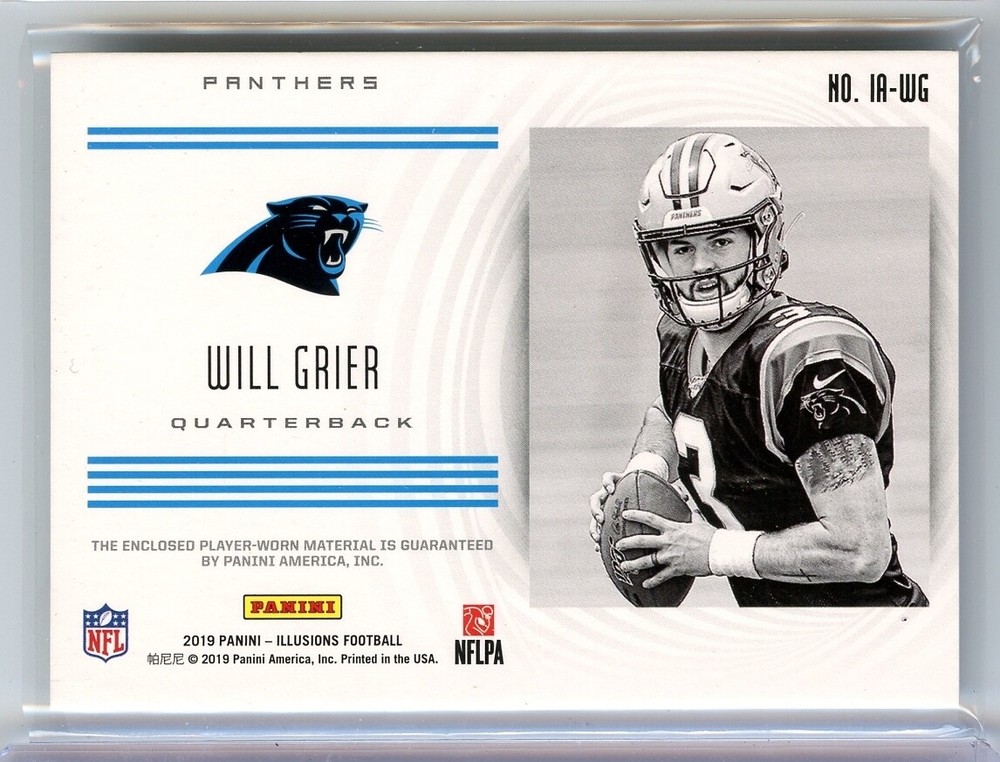The product is a 2019 Panini Illusions trading card featuring NFL player Will Grier from the Carolina Panthers. It is part of the Instant Impact Jerseys subset, with a 3-color relic piece embedded in the card. This specific card is numbered 20 out of 50, making it a limited edition collectible for fans and collectors. The card is an original release by Panini and falls within the modern era of football trading cards.