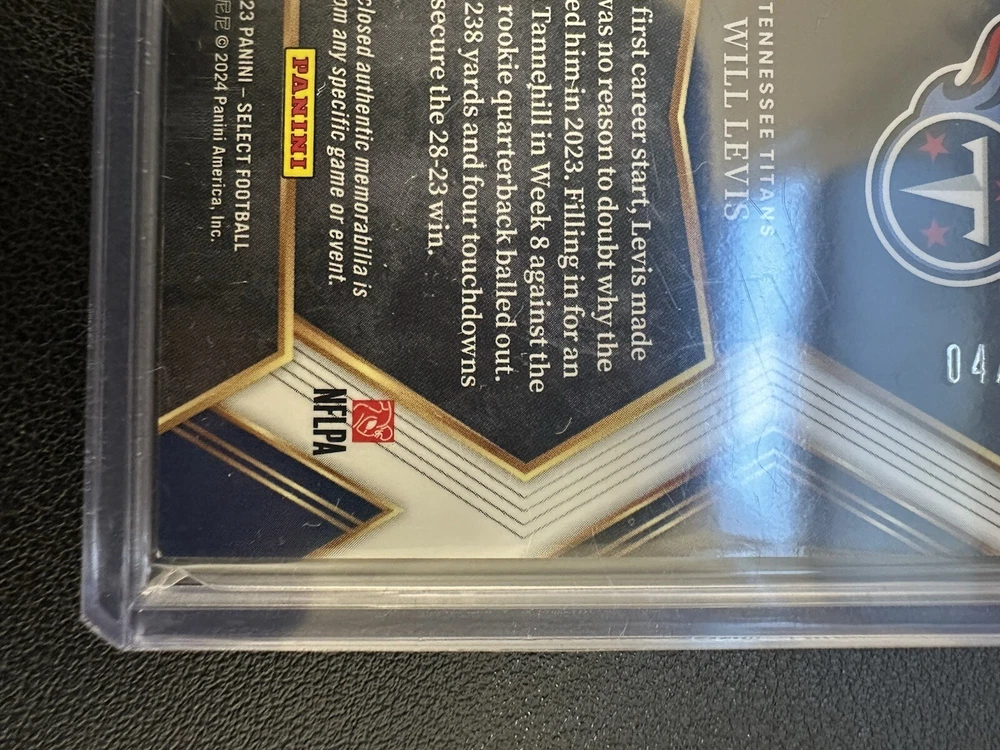 League: National Football League (NFL) Material: Card Stock Year Manufactured: 2023 Vintage: No Set: 2023 Select Original/Licensed Reprint: Original Country/Region of Manufacture: United States Manufacturer: Select Sport: Football Season: 2023 Team: Tennessee Titans Features: Rookie Card Size: Standard Card Thickness: 130 Pt. Player/Athlete: Will Levis Language: English Autographed: No Print Run: 25 Type: Sports Trading Card Parallel/Variety: Tie-Dye Prizm