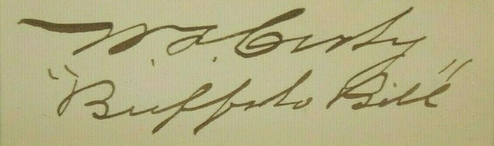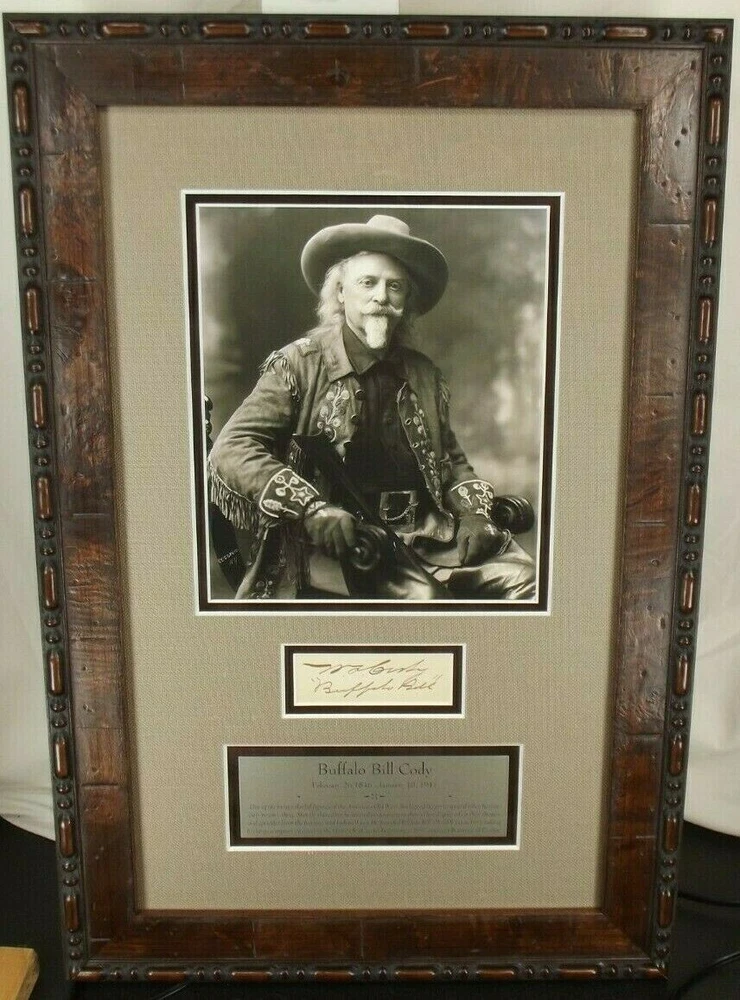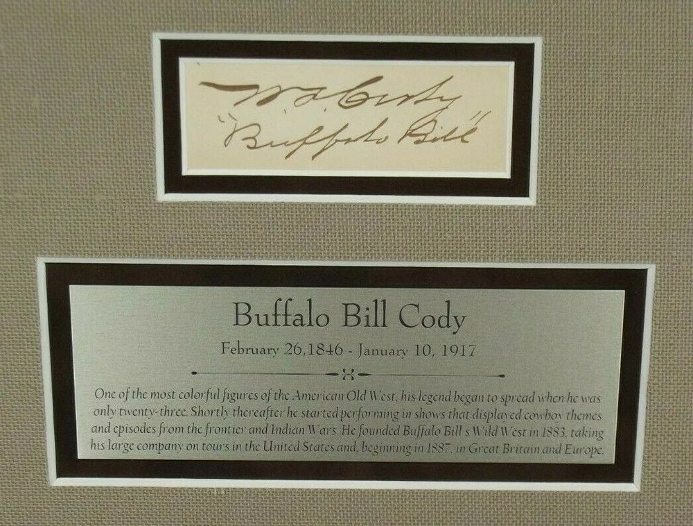 William Frederick ''Buffalo Bill' Cody [1846 1917] was a American scout, bison hunter and showman who was born in the Le Claire Iowa Territory later known as the U.S state of Iowa. Cody began working at the age of 14 as a rider for the Pony Express and served with the Union Army during the American Civil War. Cody received the nickname ''Buffalo Bill'' after the American Civil War when he had a contract to supply Kansas Pacific Railroad workers with buffalo meat and it is purported he killed over 4,000 buffalo between 1867 and 1868. After the war he served as a civilian scout for the U.S Army during the Indian Wars and was awarded the Medal of Honor in 1872. Cody is considered one of the most colorful figures of the American Old West and Bill's legend began to spread when he was only twenty-three when he began performing in shows that displayed cowboy themes and episodes from the frontier and Indian Wars. In 1883 he founded the Buffalo Bill's Wild West Show and began touring the United States and in 1887 he toured in Great Britain and Europe. Listed for auction is a stunning display which contains the authenticated autograph of William Frederick ''Buffalo Bill'' Cody. The autograph is signed on a card, ''W.F. Cody'' and he added ''Buffalo Bill'' in black fountain pen. The card measures 3.50 x 2.50 inches, with 3.50 x 1.50 inches displayed, other then trivial even toning the autograph is in fine condition and is bold and displays wonderfully. The autograph has been authenticated by JSA, James Spence Authentication and will be accompanied with the above Letter of Authenticity. The display has been assembled around a wonderful formal b/w portrait 7.00 x 9.00 of Buffalo Bill. Mounted below is a professionally engraved plaque which reads as follows, ''William Frederick ''Buffalo Bill'' Cody. February 26, 1846 - January 10, 1917. One of the most colorful figures of the American Old West, his legend began to spread when he was only twenty-three. Shortly thereafter he started performing in shows that displayed cowboy themes and episodes from the frontier and Indian Wars. He founded Buffalo Bill's Wild West in 1883, taking his large company on tours in the United States and beginning in 1887, in Great Britain and Europe. The display itself is stunning and has been professionally assembled in acid free materials as follows, each item has been matted in a beige linen outer matte and accented with a brown inner matte. The display has been completed in a western themed quality ornate distressed brown wood frame to the dimensions of 21.00 x 14.00 inches. The autograph is a wonderful example, authenticated, bold, beautifully framed and ready to be displayed in your collection. Absolutely no disappointments . We have listed a nice collection of aviation, military and astronaut autographs. Dear Collector, we are regularly adding autographed framed displays to our eBay Store. The following is a sample of our inventory, Harry Houdini, Marilyn Monroe, George Custer, Elvis Presley, U.S. Presidents John F. Kennedy, Harry S. Truman, Franklin D. Roosevelt, Theodore Roosevelt, James Garfield, James Monroe, Erwin Rommel, Robert Oppenheimer, Bela Lugosi, Boris Karloff, Ernest Hemingway, Abner Doubleday, Auguste Bartholdi, Buffalo Bill Cody, Walt Whitman, Charles Dickens, Margaret Mitchell, Thomas Edison, Charles Lindbergh, Amelia Earhart, Alexander Graham Bell, Laurel & Hardy, Charlie Chaplin, George Patton, Gutzon Borglum, Samuel F. B. Morse, Brigham Young, Wernher von Braun, Lon Chaney Jr, P.T. Barnum, Apollo Astronaut crews, and many more. Please have a look and feel free to contact us with any questions. Happy collecting from collectors.view Autographs. Authenticity/Return Policy/About Us. Dear collector, we are lifetime autograph collectors and an autograph dealer with over 20 years of autograph sales on eBay. We believe the purchase of an autograph is a monetary investment. Our policy is simple, all our autographs are researched and guaranteed authentic with ''No'' time limits. All sales will be accompanied with our Certificate of Authenticity, and we also offer a 30-day unconditional return policy, If the autograph or display you purchased is not as stated or is not to your expectation simply return and we will refund your full purchase price along with your return shipping costs. We are also a Top-Rated eBay seller with thousands of satisfied customers. We feel you should be comfortable with your purchase and our policy reflects this. United States and Overseas Shipping/Handling. Please Read.... Dear collector, shipping in the U.S is free unless otherwise noted in the auction description. Your auction will be well packed and shipped United States Postal Service 1st class with delivery tracking with the exception of larger framed items which will be shipped United States Priority Mail with signature confirmation. To our overseas customers shipping is as follows, your auction will be shipped through eBay's Global Shipping Program. Note, the limit for shipping an auction overseas is 2500.00 dollars, any auction above this price cannot be shipped. We do combine shipping on paper items [letters, photographs, album pages, etc.] purchased together. Also please note we do not have control over a package once it has shipped and import duties, taxes and custom charges are determined by the Global Shipping Program. Thank you for your purchase, your auctions will be well packed and shipped upon payment. Sign up for my email newsletters by adding my eBay Store to your Favorites