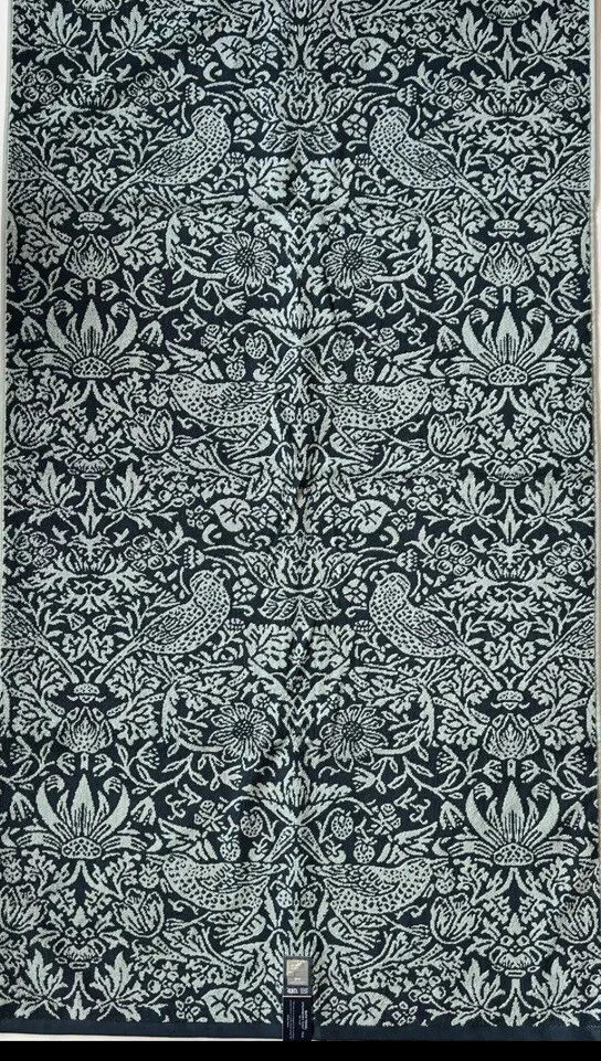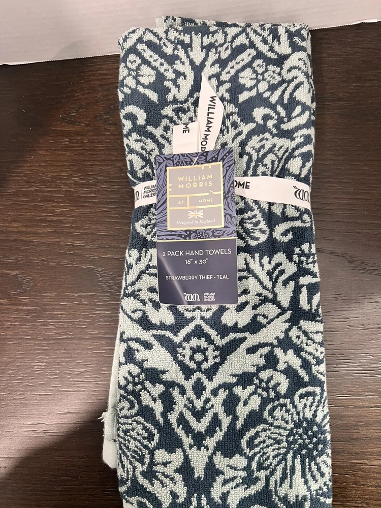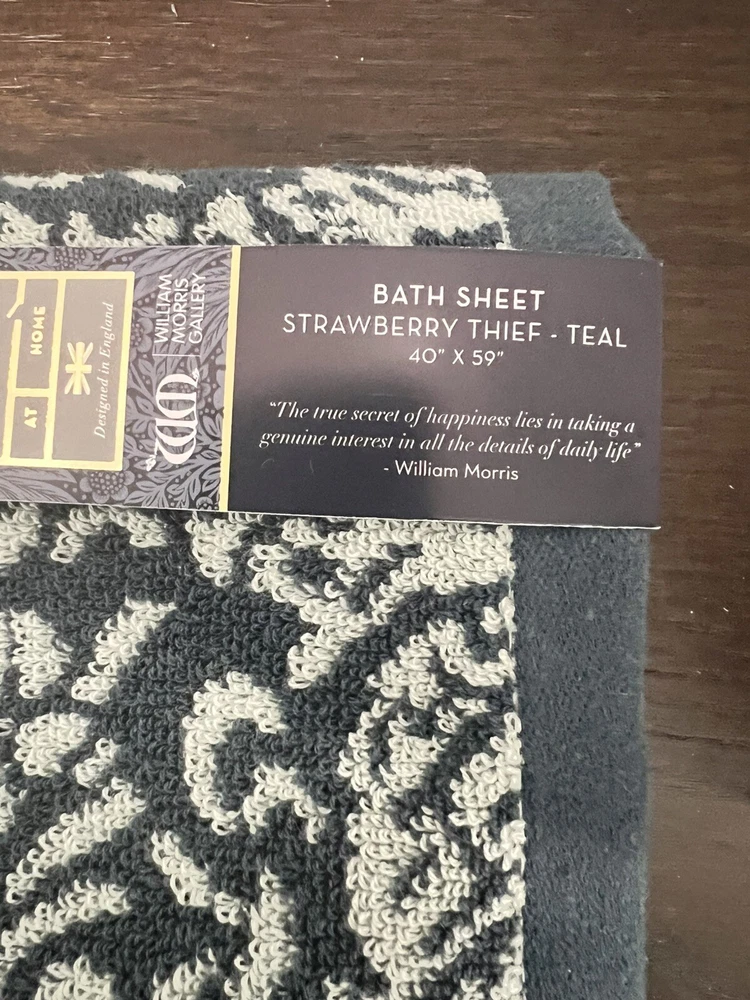The William Morris Strawberry Thief Teal towel set includes two bath towels and two hand towels in a four-piece set. The towels are made of 100% cotton and are OEKO-TEXT and Standard 100 certified. The set features a rectangular shape and bath towels measures 40 inches by 59 inches. The towels are designed with a Strawberry Thief Teal pattern and are suitable for use in the bathroom, guestroom, or utility/laundry room. Care instructions include tumble drying, machine washing with like colors, and avoiding bleach. The set is part of the Original Morris & Co product line and is manufactured in Pakistan. Bath towels are larger than average size. Beautiful and unique designs. Smoke free home