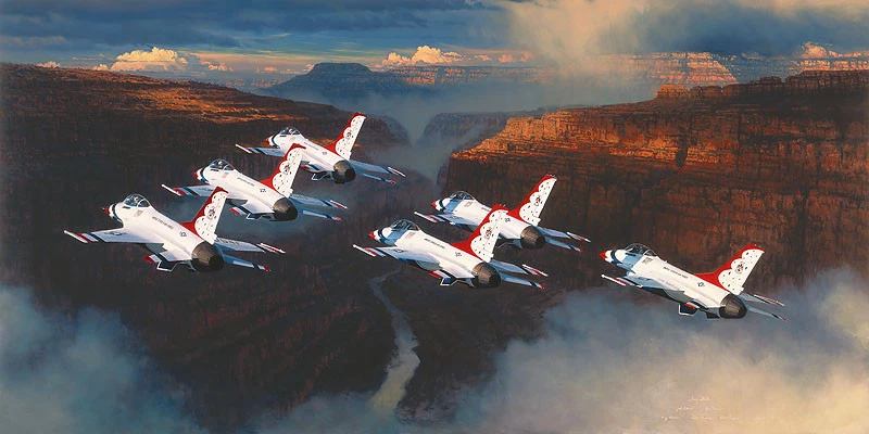 WILLIAM PHILLIPS " Thunder In The Canyon " 45 Signed & Numbered Limited Edition Masterwork Canvas 44" x 22" in image size MINT CONDITION This is a limited edition GICLEE Canvas signed and numbered by William S. Phillips . It is in perfect, mint condition. It has its certificate of authenticity and write up on this incredible artist. This canvas is guaranteed to arrive MINT and in perfect condition. We offer free shipping, completely insured everywhere in N. America! -------------------------------------------------------------------------------------------------------------------------------------------------------------------------------------------- We hear the dominant roar of freedom’s voice as the U.S. Air Force Demonstration Squadron, the Thunderbirds, pulls tightly into its famed delta formation and slices into turbulent air above Arizona’s Grand Canyon. We listen for an echoing growl of thunder as a mythical Thor reigns throughout the sky, leaving distant vestiges of a passing storm. Our eyes are drawn throughout the painting, from the Colorado River far below to the crimson, sun-tipped heights, from the misty clouds hovering over the gorge to the tops of the cumulus build-ups reflecting a welcoming sunlight. We are invited to share the artist’s two loves―landscape and aviation. Phillips has researched his subjects well. He has flown over and hiked throughout the majestic canyon, familiarizing himself with its dramatic buttes, mesas and the variegated beauty of its eroded walls. He has flown with the Thunderbirds, the name honoring the Native American legendary and masterful bird and with tactical F-16 squadron pilots. The Thunderbirds, resplendent in red, white and blue, represent the U.S. Air Force and the United States of America and invoke feelings of pride and patriotism in the millions of people who are treated to their aerial displays. The elite team, which performed its inaugural flight in 1953, was equipped initially with the F-84G aircraft. Thirty years after rising from the Southwestern desert at Luke Air Force Base, the team selected the sleek F-16. Since 1983, this multi-task fighter has benefited the Squadron and all who fly her in protection of the boundaries of twenty-four nations. Phone us toll free anywhere in N. America - anytime ! We are authorized dealers with almost every publisher in N. America and know we can list world class artists at remarkable prices !! We offer FREE pick up of winning items at our Canmore Art gallery located in Canada's beautiful Rocky Mountains. Shipping is done in some of the best built, strong boxes ever seen - always completely insured . Any problems and we ship a new piece immediately - no cost to you!! Think we have superior service, come check out our ART COUNTRY CANADA Gallery on your next visit to BANFF NATIONAL PARK . We will send an email within 24 hours of the auction ending. Canadian residents add GST. We accept paypal and anyone can call the gallery toll-free with a visa or mastercard. We try to ship the same day, but some items may ship the following week. Shipping Information All items are completely insured to arrive in MINT condition! We ship in some of the strongest boxes in the industry! Art Country Canada Gallery Art Country Canada Rocky Mountain Art Gallery 729 Main Street Canmore , Alberta T1W 2B2 Mill Pond Press Dealer / Somerset Publishing Dealer / Wild Wings Dealer and many more TERMS OF SERVICE EBAY is one side of our business, having a fine art gallery we are able to custom frame most items in our gallery. We work hard to do business the old fashioned way, we treat all customers as if they are family. We answer emails courteously and are fair in all our dealings. We have a toll free number for easy service. Please feel free to contact us at anytime, with any question or comment. We make every effort to answer all emails as quickly as possible. WORLDWIDE SHIPPING We sell and ship worldwide, so please email us for a quote to any location, we dropship to any address if it is a gift. We charge shipping based on the Canadian Postal System and all items are sent fully insured. METHODS OF PAYMENT We accept Paypal which accepts the major credit cards, or we also take Credit Cards Directly over the phone, (MC, VIS A,). We accept whatever method is most convenient for you. We ask all auctions to be paid for in the fastest possible time frame. LOCAL PICK UP We encourage customers to pick up items at our gallery. Let us know if you want your item framed. We offer incredible custom framing designs and superb pricing!