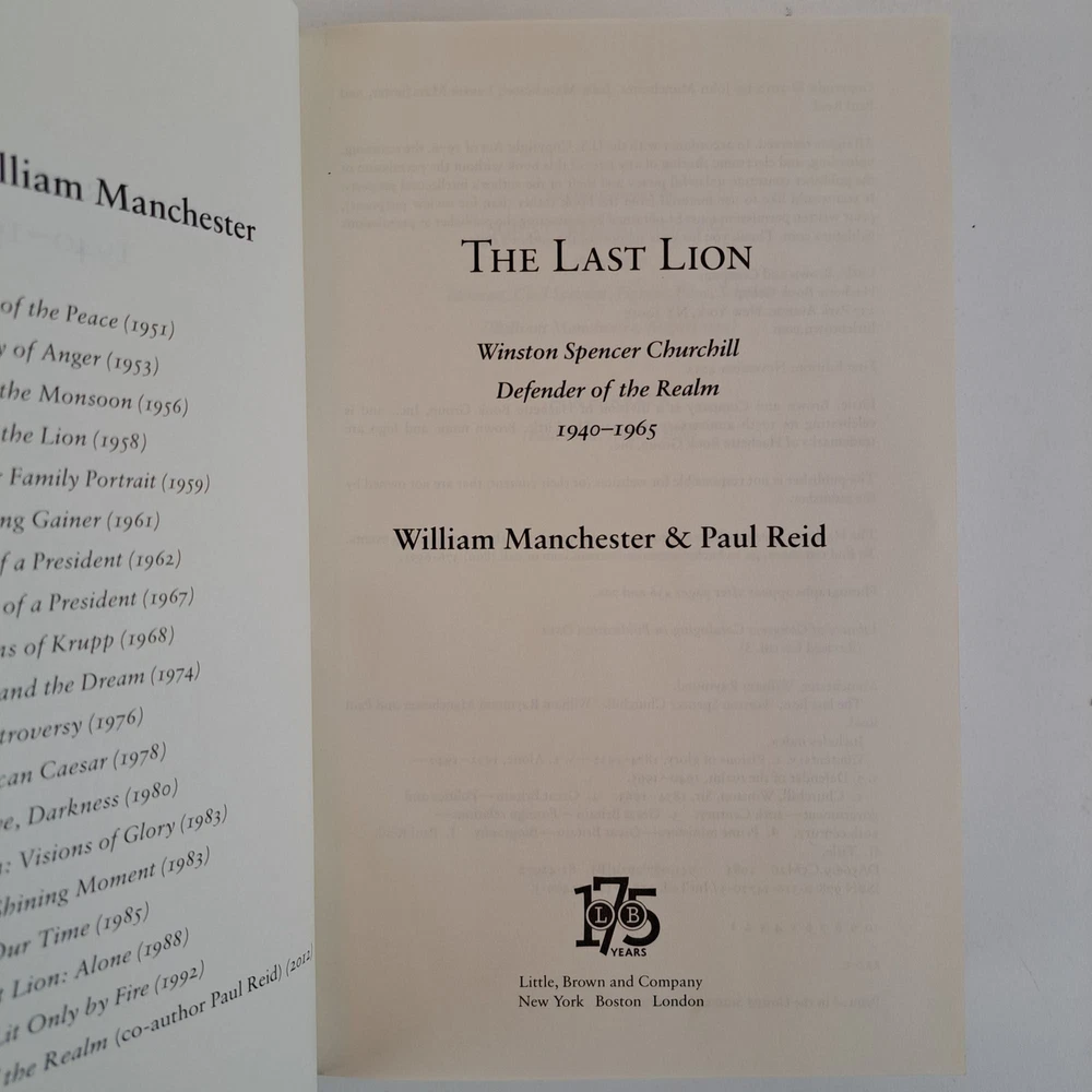 THE LAST LION: WINSTON SPENCER CHURCHILL DEFENDER OF THE REALM, 1940-1965 Author: Manchester, William [Author] Reid, Paul [Author] Title: THE LAST LION: WINSTON SPENCER CHURCHILL DEFENDER OF THE REALM, 1940-1965 Publication: New York, New York: Little, Brown, 2012 Edition: First Edition, First Printing Description: Octavo, 1,182 pages. In Very Good condition with Near Fine condition dust jacket. Spine is navy and red with white lettering. Dust jacket protected by mylar covering, price uncut: "$40.00" on front flap. Boards have mild shelving wear along spine head and tail. Shelved in hallway. Seller ID: 1387397 Subject: European History, Politics, Government, and Law, Warfare and Conflict, World History Welcome to the eBay store of Second Story Books! DC's Oldest Rare and Used Bookstore, Second Story Books operates two open shops in the Washington D.C. metropolitan area. We have an extensive internet presence and provide accredited appraisals member ASA. This listing was created by Bibliopolis.