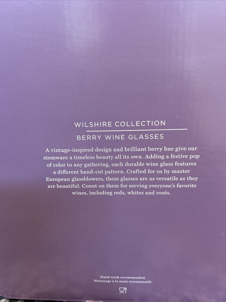 The Williams Sonoma Berry Wine Wilshire Collection Jewel Cut Set of 4 Glasses features a round shape with an etched pattern, perfect for various occasions such as Mother's Day, Christmas, and anniversaries. Made of berry glass, this set includes four wine glasses with a festive Christmas design, making them ideal for holiday gatherings or as a thoughtful gift. The elegant etched details add a touch of sophistication, while the set is suitable for serving drinks during all occasions.