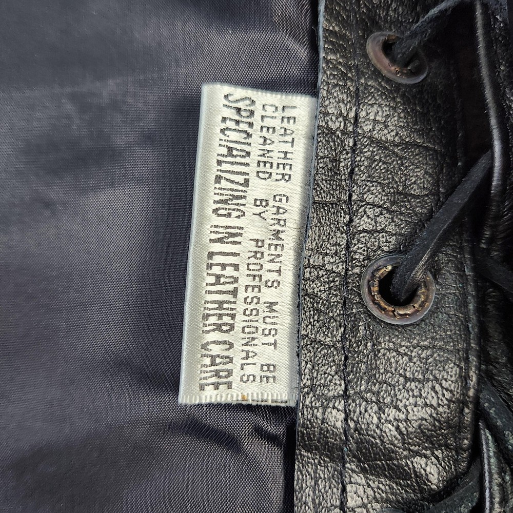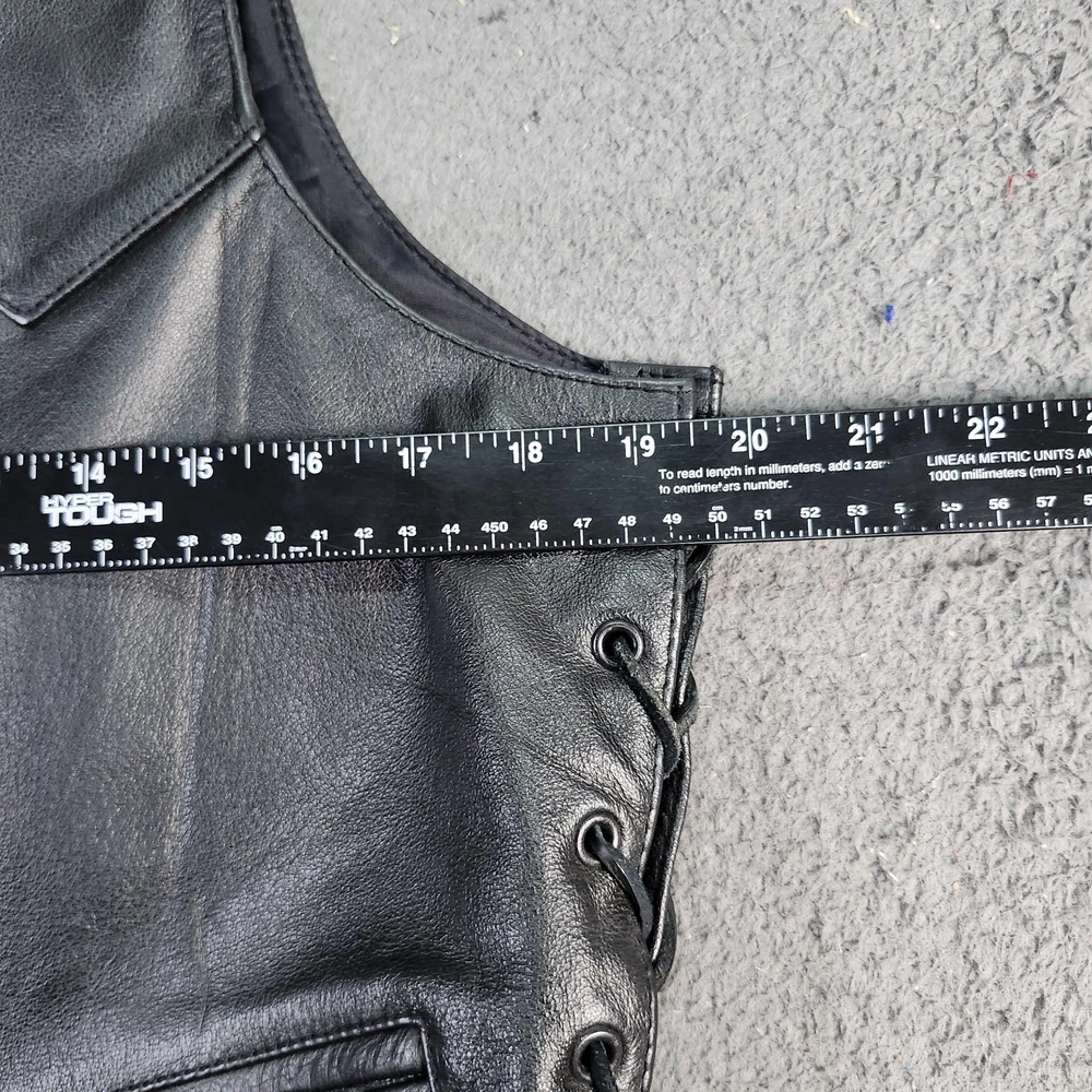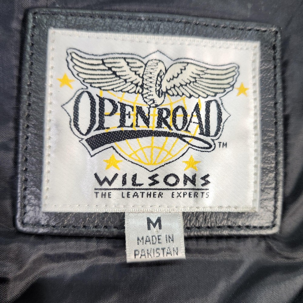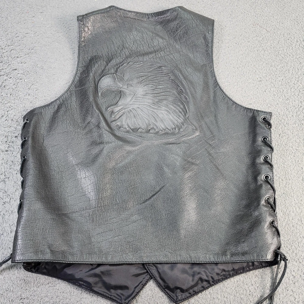 Brand: Wilsons Leather (Open Road collection). Style: Mens biker motorcycle vest with snap front closure and collarless V-neck neckline. Color: Solid black leather exterior with black lining. Size: Mens Medium (tagged M on interior Open Road Wilsons label). Material: Genuine leather outer shell with smooth woven lining (exact fiber content not listed on visible tags). Country of origin: Made in Pakistan; care tag notes that leather garments must be cleaned by professionals specializing in leather care. Design details: Four-snap single-breasted front, angled western-style front yokes, two front welt pockets, and full interior lining for comfort. Side and back details: Adjustable lace-up sides with metal grommets for fit and layering over shirts or jackets, plus a large embossed eagle head graphic on the back panel for classic biker styling. Features and use: Collarless leather riding vest ideal for motorcycle wear, casual layering in fall and spring, and biker or motorcycle-themed outfits where a tough, classic leather look is desired.