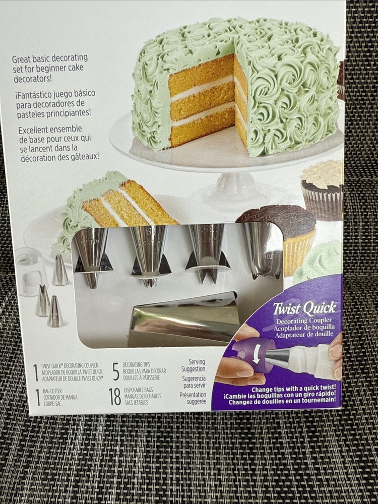 Wilton Cake Decorating Set - 25 Pieces Stock Number 2104-5839 Includes: 5 decorating tips (3, 18, 127, 352, 233) 18- 12 in disposable decorating bags 1 Twist Quick decorating coupler 1 bag cutter Illustrated decorating techniques