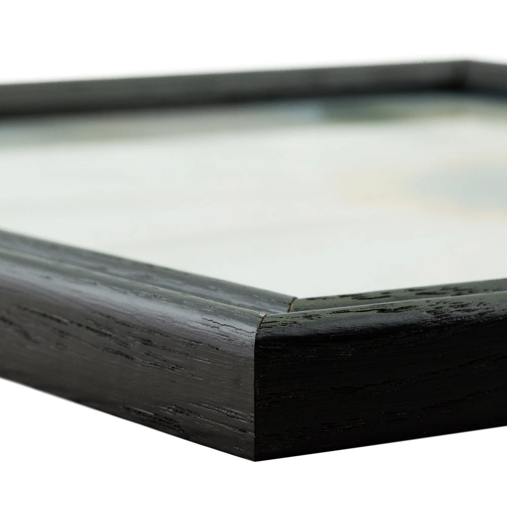 This simple black picture frame offers a winning combination of quality, finish and affordability. The Wiltshire ash frame series are constructed from North American ash trees. This .75" moulding—finished with semi-gloss Ebony stain—showcases wood grain patterns unique with each frame. The traditional styling of the Wiltshire ash is ideal for a wide range of prints and decor. Traditional style; shiny black with wood grain finish Frame includes: white matting, glass, rigid black backing and pre-attached stamped hanging hardware Matted frame is designed to display a 4x6 print. Actual mat opening is 3.5x5.5. Frame will display a 5x7 print without the matting. Frame moulding is 0.75 inch wide; solid Ash wood Frame is designed for WALL HANGING only (hardware allows for portrait or landscape orientation)