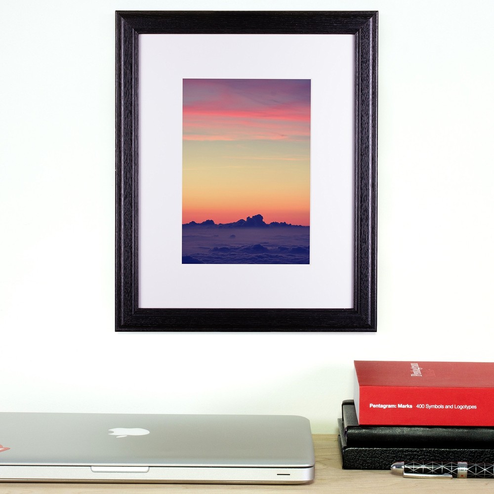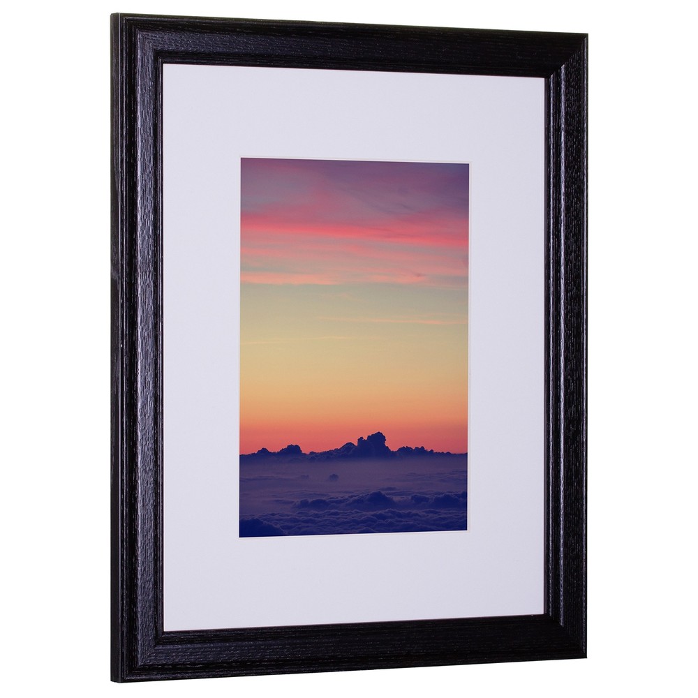 Traditional style; semi-gloss black stain finish; visible wood grain **COLOR AND GRAIN PATTERN MAY VARY SLIGHTLY WITH EACH FRAME** Frame includes: white matting, clear acrylic facing, rigid cardboard backing and wire hanging hardware kit (some assembly required) Matted frame is designed to display a 16 x 20 inch photo/print/poster (matting will overlap image by .25" on each side). Frame will display a 20 x 24 inch photo/print/poster without the matting (frame lip will overlap image by .25" on each side). Frame moulding is 0.75 inches wide; solid Ash wood construction Frame is designed for WALL HANGING only (hanging hardware allows for portrait or landscape orientation)