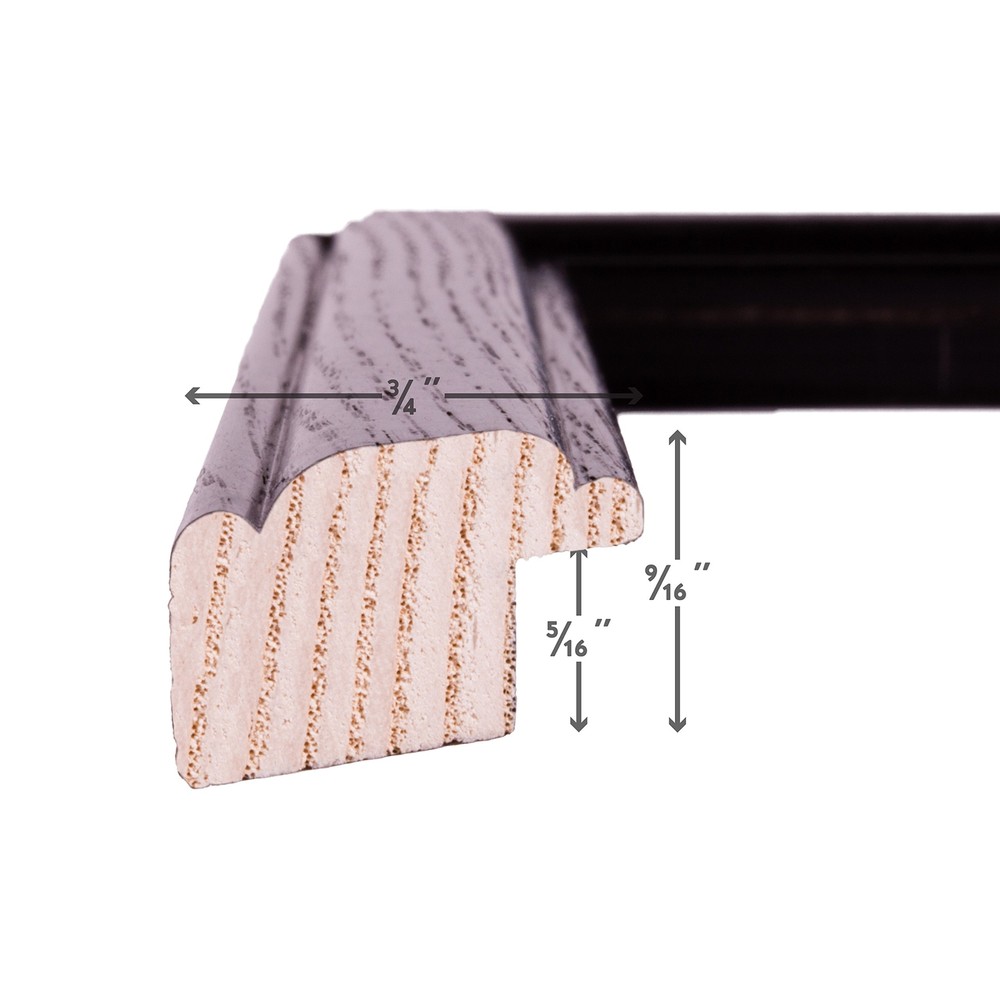 Traditional style; semi-gloss black stain finish; visible wood grain **COLOR AND GRAIN PATTERN MAY VARY SLIGHTLY WITH EACH FRAME** Frame includes: white matting, glass, rigid black backing and pre-attached stamped hanging hardware Matted frame is designed to display a 5 x 7 inch photo/print/poster (matting will overlap image by .25" on each side). Frame will display a 8 x 10 inch photo/print/poster without the matting (frame lip will overlap image by .25" on each side). Frame moulding is 0.75 inches wide; solid Ash wood construction Frame is designed for WALL HANGING only (hanging hardware allows for portrait or landscape orientation)