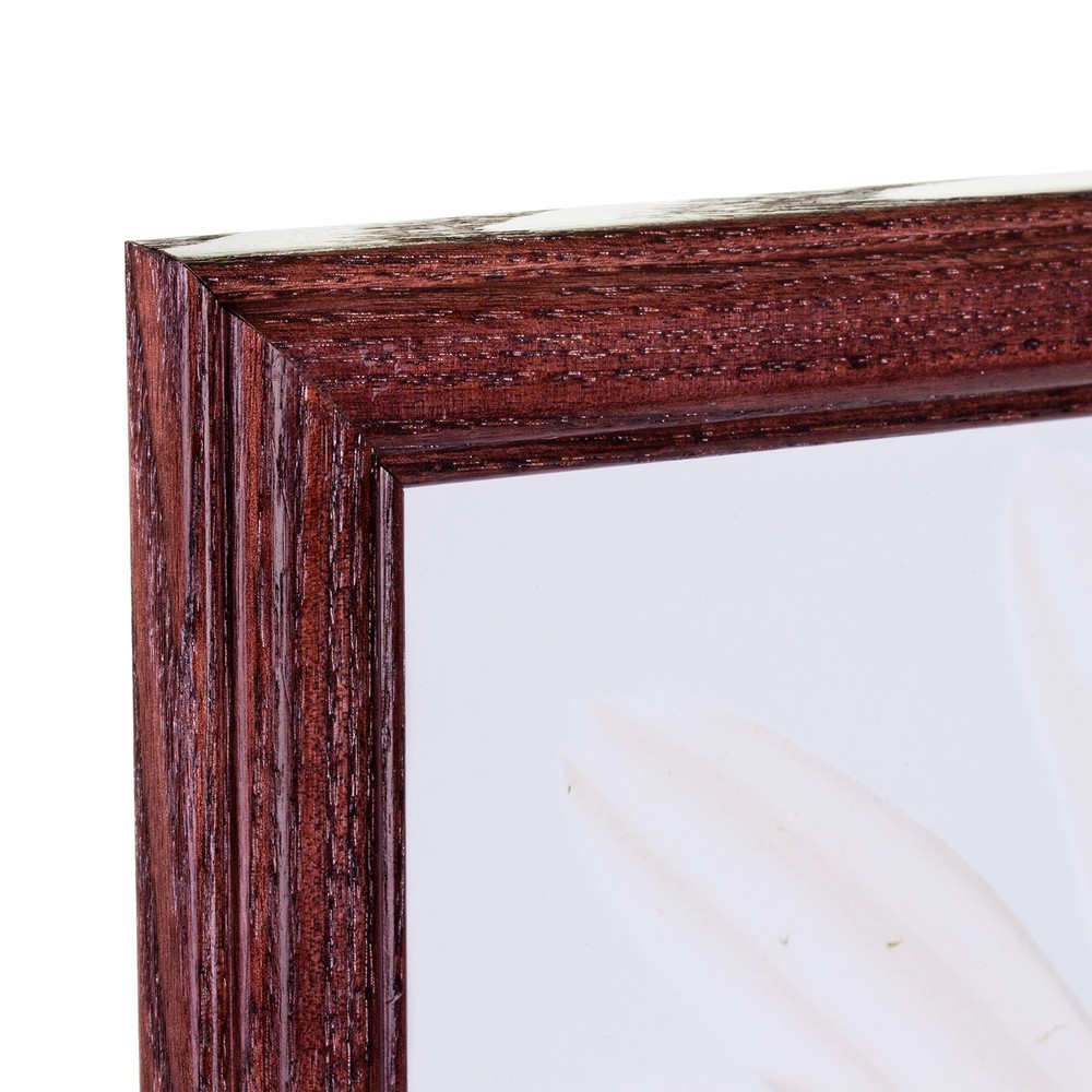 Traditional style; semi-gloss cherry red stain finish; visible wood grain **COLOR AND GRAIN PATTERN MAY VARY SLIGHTLY WITH EACH FRAME** Frame includes: white matting, glass, rigid black backing and pre-attached stamped hanging hardware Matted frame is designed to display a 4 x 6 inch photo/print/poster (matting will overlap image by .25" on each side). Frame will display a 5 x 7 inch photo/print/poster without the matting (frame lip will overlap image by .25" on each side). Frame moulding is 0.75 inches wide; solid Ash wood construction Frame is designed for WALL HANGING only (hanging hardware allows for portrait or landscape orientation)