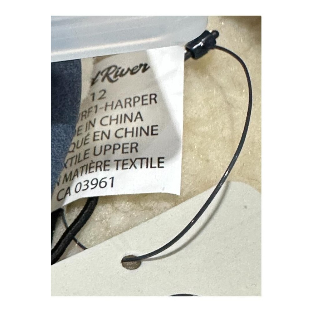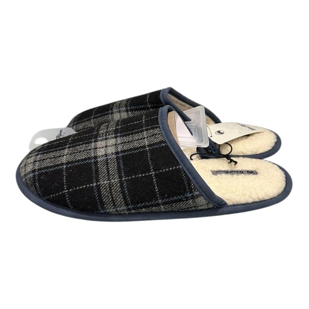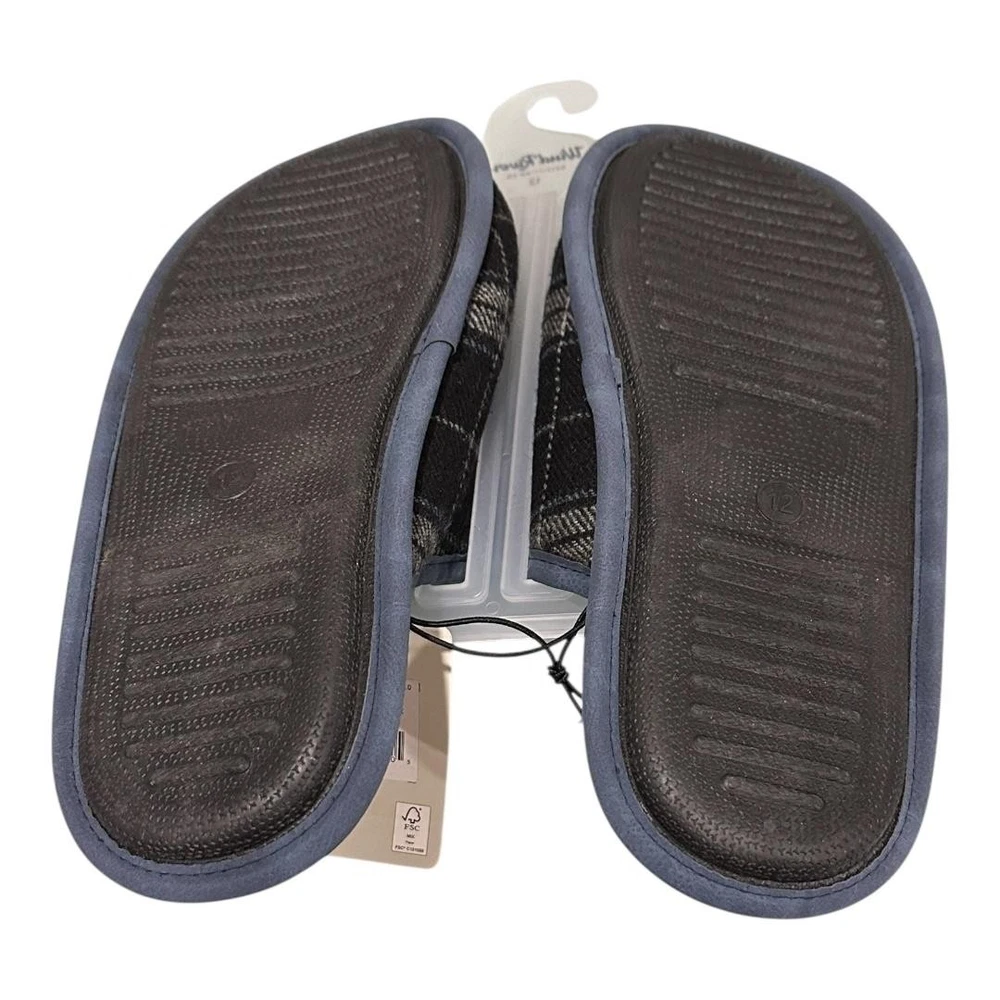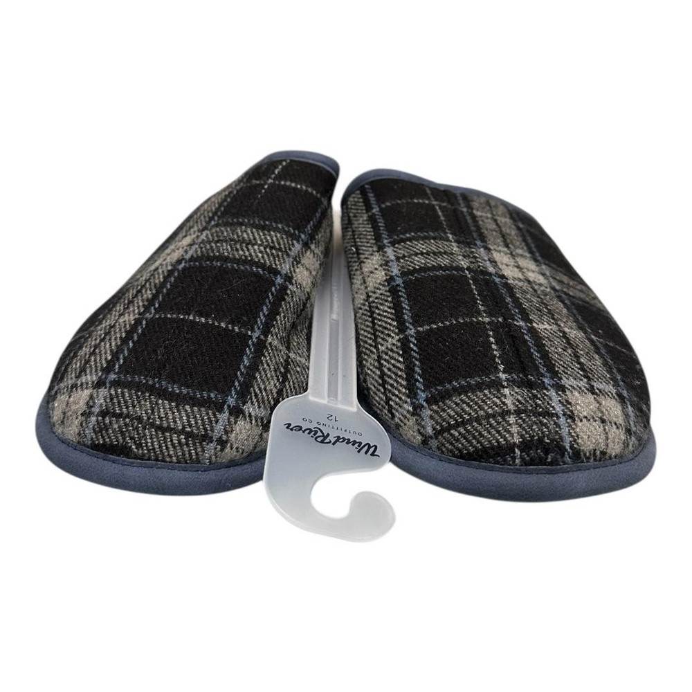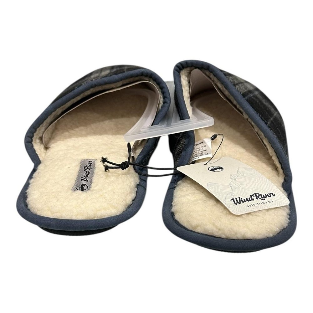 Brand: WindRiver Style: Mens slip-on mule house slippers, Harper model designed for casual indoor wear and home lounging. Color: Black and gray plaid fabric upper with subtle blue accents, trimmed with dark blue binding and cream faux fur footbed. Size: Mens US 12 (tagged 12 on interior size label, molded 12 on rubber outsoles and plastic retail hanger). Materials: Textile fabric upper, soft faux fur lining and insole, textured rubber outsole, flat heel under 1 inch, standard width fit. Details: Closed round toe with open-back mule construction for easy slip-on comfort, plush faux shearling-style footbeds for warmth, lightweight cushioning, and slip-resistant rubber soles suitable for indoor floors and short trips outside. Tags and identifiers: WindRiver woven logo label on footbeds; branded hang tag attached reading WindRiver Outfitting Co; interior label with style/model code WRF1-HARPER, size 12, textile upper, CA 03961, made in China; non-vintage modern design. Special notes: New unworn slippers ideal for everyday home comfort and lounging; original shoebox not included.