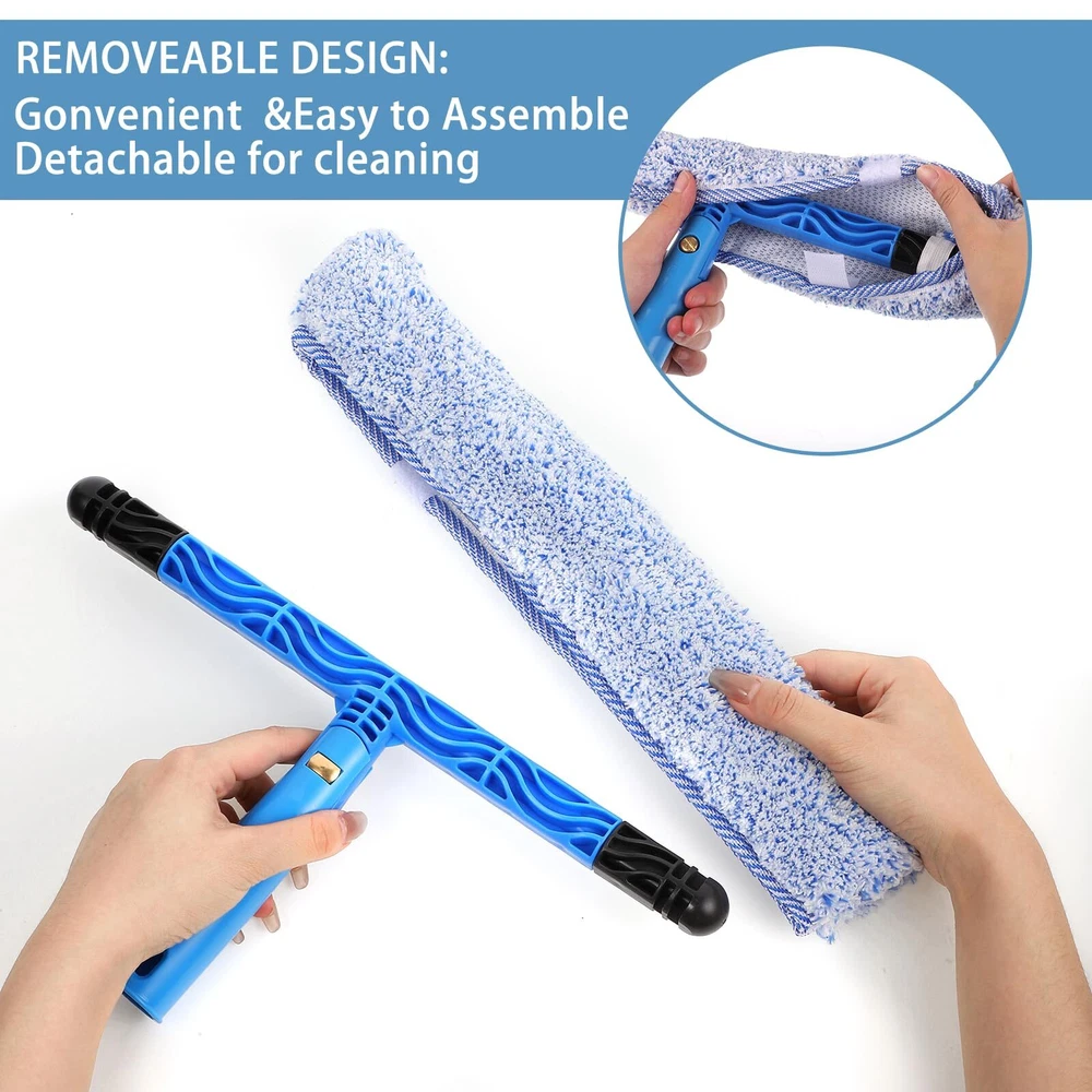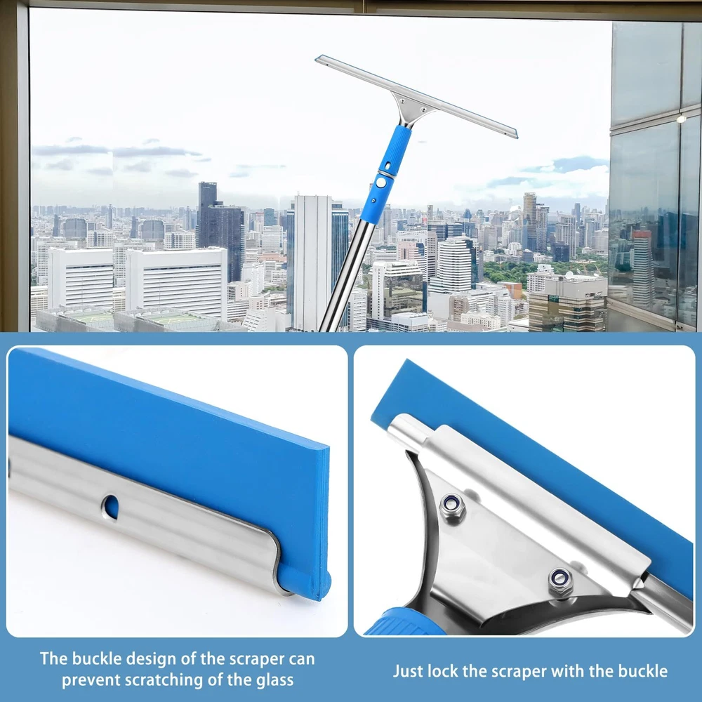 【Window Cleaning Set】Our window cleaning kit contains 1 glass squeegee, 1 microfiber scrubber, 1 microfiber pads and 1 hook. This set is suitable for glass windows or any other smooth surface. The squeegee is made of soft silicone. Long lasting and won't leave marks and scratches on windows. 【Flexible and Adjustable】It can be a handheld window washer or glass squeegee, used to clean dirt on flat surfaces or low parts of windows. It can also be used with a stainless steel retractable handle. The handle can be extended up to 63 inches to help you safely wash tall indoor and outdoor windows without the need for a ladder. 【180° Rotation Design】The microfiber scrubber can rotate 180 degrees with just one click to evenly apply the cleaner on the window glass, which is flexible and convenient. It can solve the problem of uneven application of detergent and difficulty in covering it, bringing great convenience to cleaning work. 【Convenient to Store】The matching set comes with hooks, you can hang the window squeegee washing kit in every corner which is convenient and quick, saving a lot of space. 【Wide Range of Uses】The window squeegee paired with the microfiber scrubber can effectively remove water, scale and soap scum from smooth surfaces such as shower glass doors, windows, tiles, mirrors and car glass.