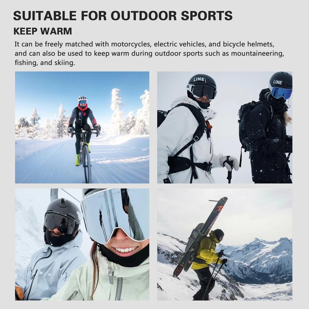 Stay warm and protected from the elements with this versatile balaclava ski mask. Crafted from soft, breathable fleece material, it provides exceptional insulation and comfort for outdoor winter activities. The form-fitting design covers your head, neck, and face, leaving only the eyes exposed for optimal visibility. This mask is perfect for skiing, snowboarding, hiking, or any cold-weather pursuit. Its stretchy construction allows for easy on and off while ensuring a snug, secure fit that won't shift or slide. The fleece fabric wicks away moisture and dries quickly, keeping you dry and cozy. Whether you're hitting the slopes or shoveling snow, this balaclava ski mask is an essential accessory for braving the cold in style. One size fits most men and women. Ultimate Protection in Cold Weather This winter balaclava is designed to provide full protection from cold winds, snow, and UV rays. Crafted from high-quality, thermal fleece material, it ensures your head and face stay warm, dry, and comfortable, even in the harshest weather conditions. Perfect for outdoor activities like skiing, snowboarding, hiking, and motorcycling. Windproof & Breathable Design The advanced windproof fabric keeps cold air out, while the breathable construction ensures that moisture is wicked away, preventing overheating and discomfort. The lightweight design makes it ideal for extended wear during outdoor adventures, providing all-day warmth without sacrificing breathability. Versatile and Multi-Use This balaclava can be worn in multiple ways to suit your needs. Use it as a full face mask, open balaclava, neck gaiter, or even a helmet liner. Whether you're skiing, snowboarding, cycling, or motorcycling, this versatile piece of cold weather gear is designed to adapt to various outdoor activities. Comfortable Fit for Men & Women With its flexible, elastic material, this balaclava comfortably fits most head sizes. It provides a snug but non-restrictive fit, ensuring comfort throughout your outdoor activities. The one-size-fits-all design makes it a great option for both men and women, ensuring everyone stays warm and protected. Ideal Gift for Outdoor Enthusiasts Looking for a thoughtful gift? This winter balaclava is perfect for anyone who enjoys outdoor activities. Whether for Christmas, New Year’s, or any special occasion, this practical and stylish accessory makes an excellent gift for skiers, cyclists, motorcyclists, hikers, and anyone who spends time in the cold.