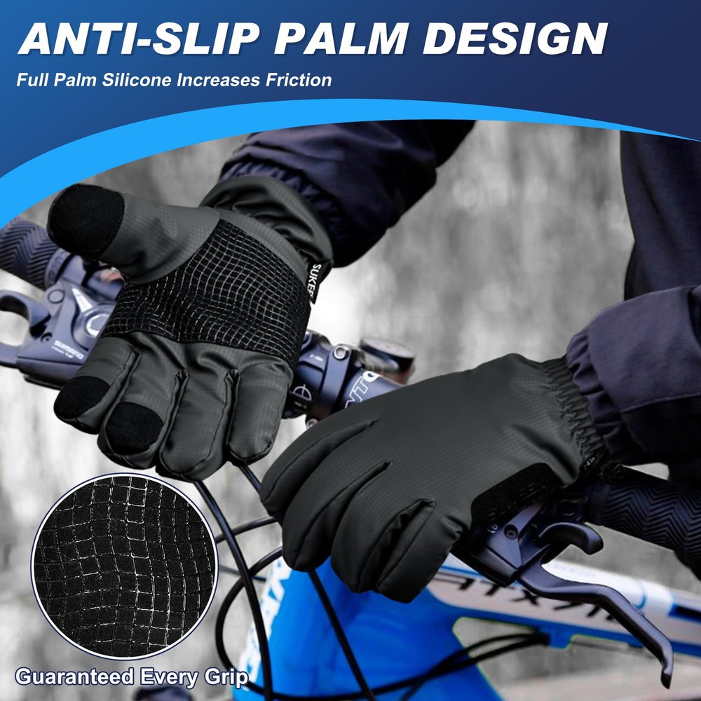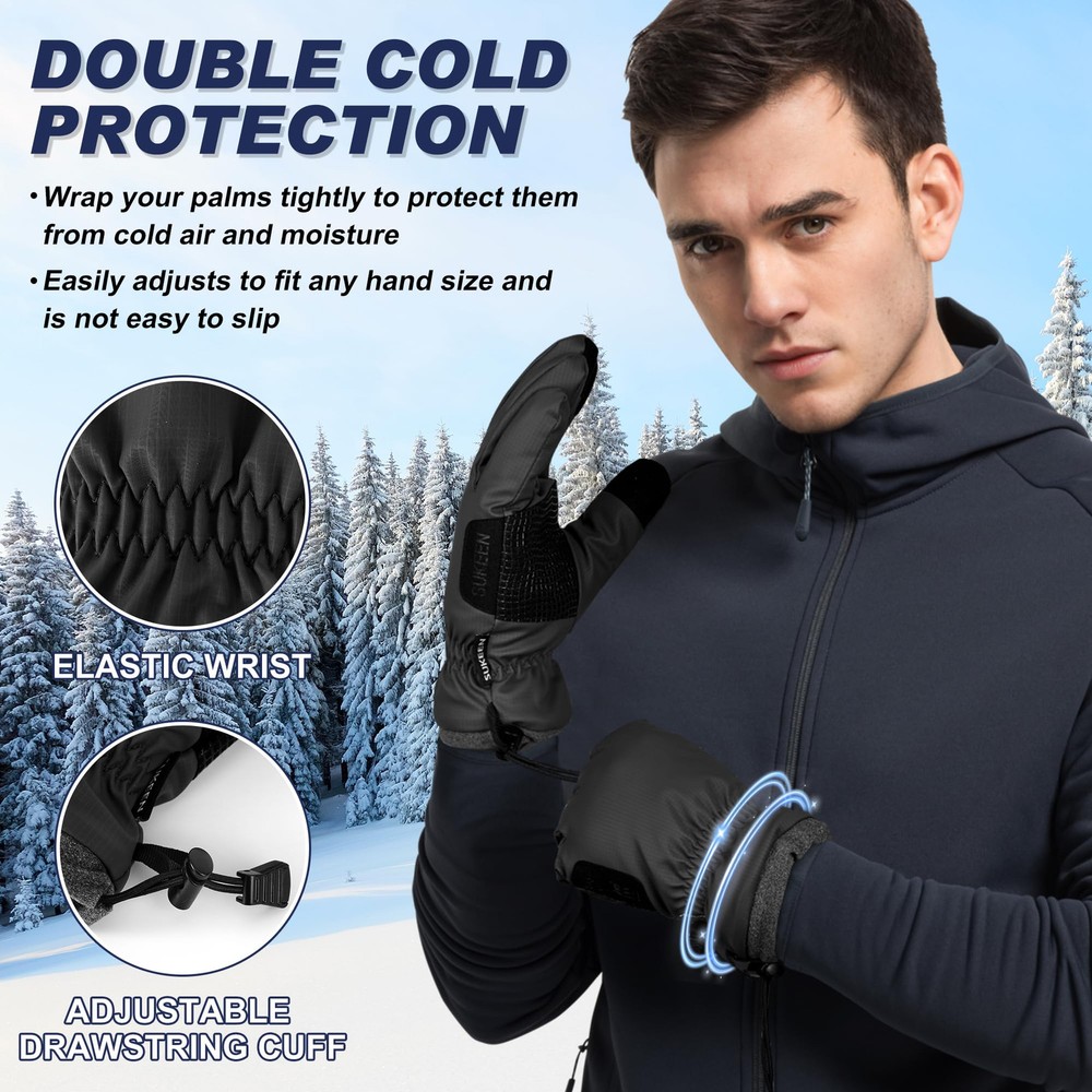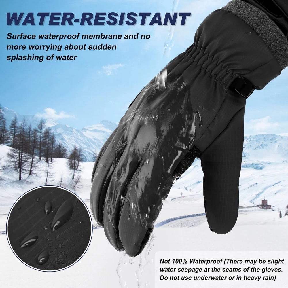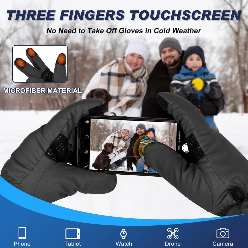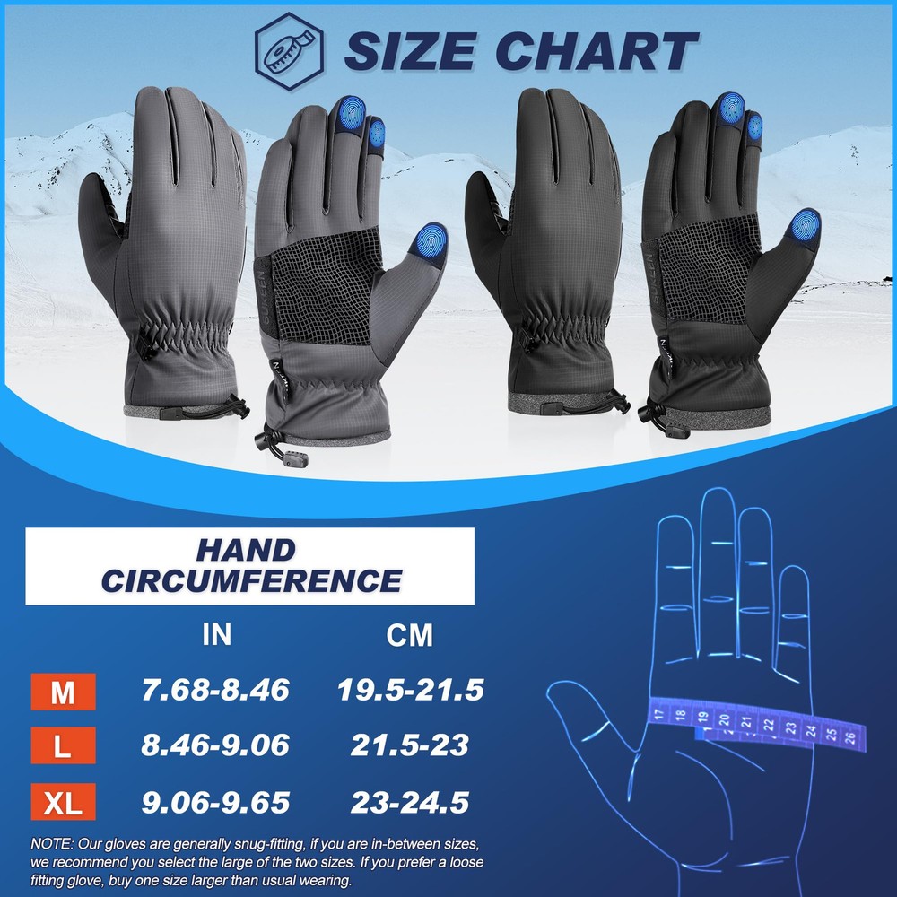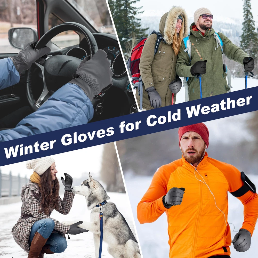 Windproof: Winter gloves for cold weather, adjustable elastic cuffs block wind and snow, keeping your hands warm and dry in cold weather; winter gloves men are perfect for walking, running, driving, cycling, skiing, snowboarding Keep Warm and Comfortable: Crafted with premium PU exterior, lined with a cozy grey arctic fleece lining and soft cotton filling, our windproof winter ski gloves for men women deliver exceptional warmth down to -4℉(-20°C), ensuring cozy hands all winter season long Non-Slip Silicone Palm: Winter snow gloves for women feature a non-slip silicone palm for excellent grip and control; Wear mens gloves winter to better protect your hands while driving, shoveling snow, cycling, skiing, camping, hiking or other outdoor activities in cold weather 3-Fingers Touchscreen: The thumb, index and middle fingers of winter gloves can touch and slide the screen, achieve seamless connection, suitable for all touch screen devices; Wearing winter gloves can easily answer calls, navigate maps or check messages without exposing your hands to the cold Easy to Carry and Store: The warm winter gloves for cold weather come with a convenient lock clip that can be securely attached, preventing loss and convenient for you to store and carry the winter gloves women, perfect for daily activities or going out Widely Use: The ski gloves men women are 2 colors and 3 sizes for choice from M to XL and you can check it in our size chart before purchase; Enjoy the excellent experience with our winter gloves in cold weathers while skiing, snowboarding, cycling, running, dog walking, hiking, climbing, driving, etc.
