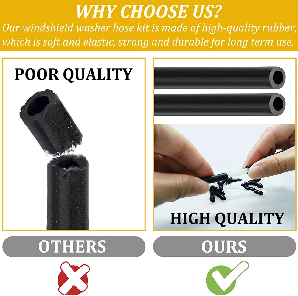 windshield washer hose repair kit -- The washer hose kit is easy to replace and install. Windshield washer hose kits help you easily and quickly replace aging hoses and properly connect your car's water pump to the windshield nozzle to ensure smooth water spraying and glass cleaning. You can replace the new windshield wiper hose repair kit by yourself to save money for your loved automotive car. Premium windshield washer Hose Kit -- Our windshield washer nozzle kit is made of high-quality rubber, which is soft and elastic, strong and robust for long term use. When you feel that your old windshield washer hose or nozzle is not workable for your car to clean the car glass, you can use our such premium windshield wiper hose kit to replace your old washer fluid hose conveniently. Compatibility -- This windshield wiper hose repair kit is compatible for most windshield washer hose and nozzles, this is because the windshield washer hose connector is universal auto parts for cleaning car glass. So, the windshield washer hose and nozzles kit is widely used in cars, SUVs, trucks, etc. Moreover, it is easy to connect car water pumps and nozzles by yourself. By this way, this windshield washer hose connector kit will give you a clear view for your car. Universal Washer Fluid Hose -- As fo the windshield repair kit, windshield washer hose is four meters long, and you can cut washer fluid hose to fit your actual needs. Also, this windshield wiper hose repair kit is included three shapes (T type; Y type; I type) of connectors to meet the needs of different cars. Never spend much money on the replacement of the windshield washer nozzle kit. Windshield Washer Hose Repair Kit -- You will get 1 x 4M windshield washer hose + 12 x windshield wiper hose connectors (including three types: 4 x T type; 4 x Y type; 4 x I type). Dimensions: Washer hose length is 4 meter/157.5 inch, inner diameter is 4.3 mm/0.17 inch, outer diameter is 6.8 mm/0.27 inch. If you have any questions about the product, please feel free to contact us and we will try our best to solve the problem. This is windshield washer hose connector kit. Product Description Universal Windshield Washer Nozzle Fluid Hose Kit, Suitable for Most Car Windshield Washer Nozzle, Connect Car Water Pump with Windshield Nozzle Features: The windshield washer hose kit is made of high-quality rubber material, which is soft, flexible, robust and can be used for a long time. Windshield washer hose kits help you replace aging hoses to keep the water spraying and glass cleaning running smoothly. This windshield wiper hose repair kit is suitable for most windshield washer nozzles. Compatible with cars, SUVs, trucks and more. Windshield washer fluid hoses that are long enough (4 meters long) to be cut as needed. The automotive replacement windshield washer hose kit is easy to replace and install. Three shapes (T-type, Y-type, I-type) of connectors are available to meet the needs of different cars. Windshield Washer Hose Kit with 4 Meter Washer Fluid Hose & 12 Pcs Hose Connectors Specifications: Material: High Quality Rubber T-type Connectors Size: 3.5 x 1.5 x 0.25 cm / 1.37 x 0.6 x 0.1 inch Y-type Connectors Size: 3.5 x 0.25 cm / 1.37 x 0.1 inch I-type Connectors Size: 3.5 x 0.25 cm / 1.37 x 0.1 inch Hose Size: Total length is 4 meter / 157.5 inch; Inner diameter is 4.3 mm / 0.17 inch; Outer diameter is 6.8 mm / 0.27 inch Package Included: 1 x 4M windshield washer hose + 12 x windshield wiper hose connectors I-type Connectors Y-type Connectors T-type Connectors