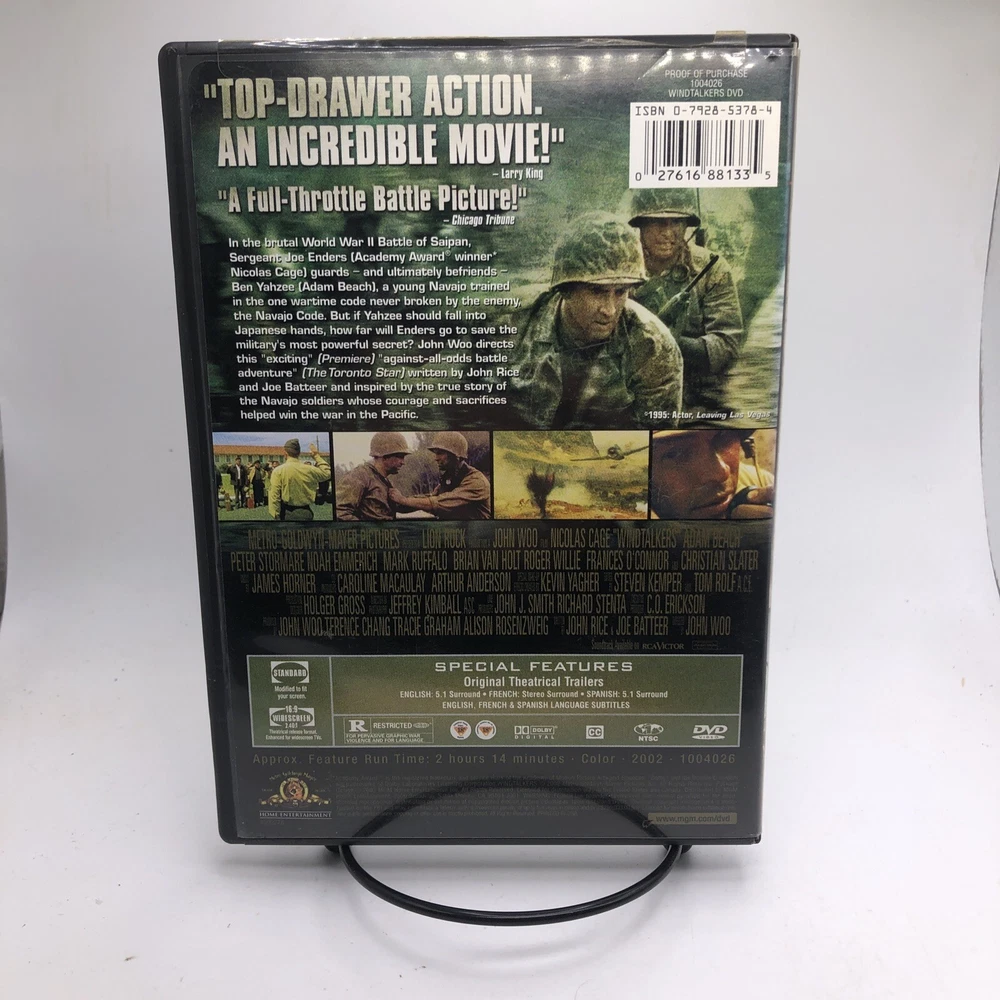 Country/Region of Manufacture: United States Release Year: 2002 Language: English UPC: 0027616881335 Case Type: Tall/DVD Case gtin13: 0027616881335 Director: Hsiang-Fei Wu, John Woo, Chen Ng Yu Movie/TV Title: Windtalkers Format: DVD Type: Movie Genre: Drama Rating: R Actor: Adam Beach, Christian Slater, Nicolas Cage Region Code: DVD: 1 (US, Canada...) Seller Notes: “Please see photos. All USED Movies will have some minor scratches and blemishes on cases.”