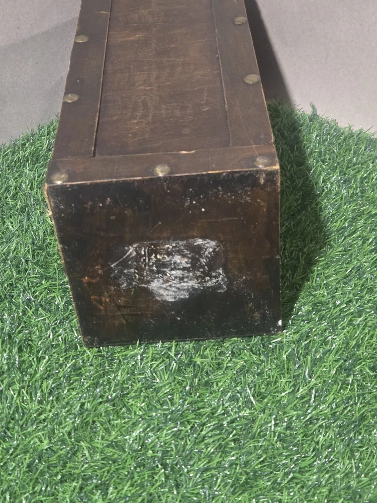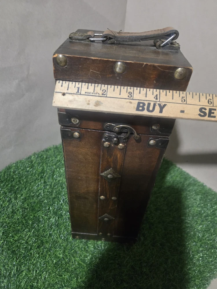 Wine Box Carrier Wood Brass Hardware Leather Like Handle Storage Gift Decor 14”. Condition is Used. Shipped with USPS Ground Advantage.
