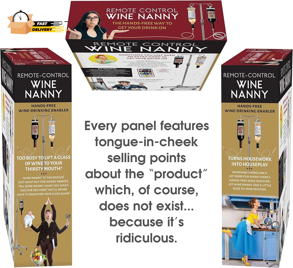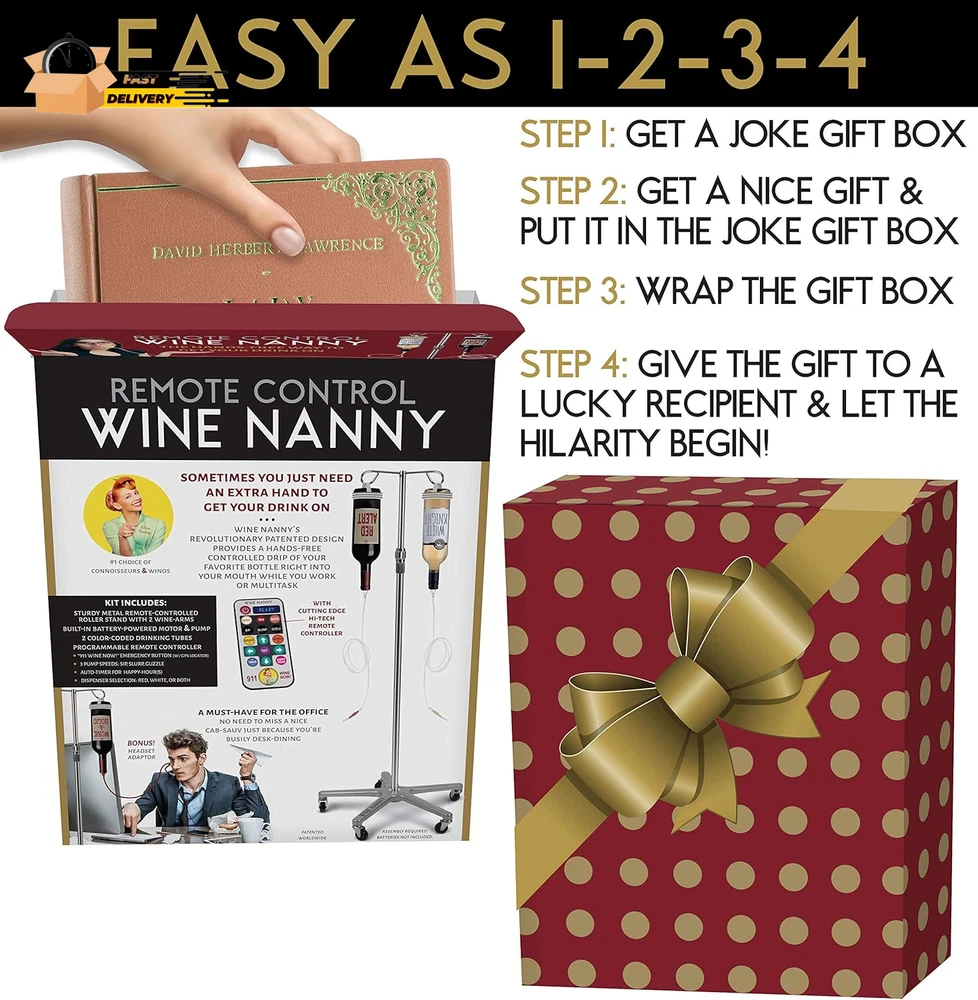 Store New Arrivals Add to Favorite View Feedback Contact "Wine Nanny" Prank Gift Box - Perfect Gag Gift for Funny White Elephant Description Item model number 1234 Unit Count 1.0 Count Style Wine Nanny Number of Items 1 Color Red Product Dimensions 11.25"L x 9"W x 3.25"H Material Glass Package Dimensions 12.13 x 11.22 x 0.63 inches Item Weight 3.52 ounces Theme Funny,Elephant Manufacturer recommended age 18 - 18 years Occasion Bridal Shower, Christmas, Birthday Manufacturer Brands Is Discontinued By Manufacturer No Cartoon Character Elephant Included Components Joke Components The ultimate joke gift box designed to look like a real, upscale product box for an absolutely ludicrous product that doesn’t really exist. Every panel is a hilarious parody of product info, selling points, instructions and warnings - all of which appear at first glance to be plausible. Transforms any gift into “that gift!” that people will be giggling about for a long time. Assembled box size is 11.25” x 9” x 3.25” - perfect for many different types of gifts. The gift box is empty, of course. The “product” is a joke. SATISFACTION GUARANTEED Gift giving is an art form, and this Wine Nanny joke gift box will undoubtedly elevate your artistry to a whole new level, helping you solidify your reputation as the most awesome gifter ever. What better way to create a memorable gifting moment than to prank your friend or loved one by disguising your present as something completely ridiculous, yet possibly desirable for serious wine enthusiasts who have secretly dreamed of having such a gadget. When the recipient unwraps your gift and sees the package for what they’re supposedly getting, there is bound to be a plethora of reactions, ranging from puzzlement, to possibly delight at the thought of having wine delivered to their mouth by a remote control IV stand on wheels, to “wait, how does that big thing fit in this box?” Whatever the responses, laughs are sure to follow once they realize they’re being merrily pranked. (Note: for those who say "oh darn, I was really hoping for a remote control wine nanny", you should probably have a nice glass of their favorite vino at the ready to sooth their disappointment) Ideal for any occasion - Christmas, holidays, birthdays, white elephant gift exchanges, bachelorette parties, bridal showers, or any time you need a gift that will definitely stand out from the rest. These hilariously tongue-in-cheek gift boxes are guaranteed to liven up any gift giving event, not to mention provide priceless photo opps and stimulate giggle-worthy commentary. Unlike the non-existent product the box purports to hold, these high quality gift boxes are super easy to assemble and use. Just unflatten it, close the bottom flap put your real gift(s) inside through the top flap, wrap it up with gift paper (or not, if you’re a minimalist), and give it! Let the hilarity ensue! ABOUT US We offer the best prices around on high quality products. Our E-store includes media such as books, movies, music and games while offering electronics, toys, sporting apparel, clothing, tools, general home, garden items and more. SHIPPING We are always working hard to ensure your package arrives as soon as possible. Please understand that some factors like weather, high postal traffic, and the performance of shipping companies are outside of our control. We offer free shipping to the lower 48 states and ship within 2 business days of payment, usually sooner. We do not accept P.O. Boxes. Please provide a physical address. For shipping outside of the continental USA, we only use eBay's Global Shipping Program.The item is shipped to KY and then sent to the rest of the world. International customers are responsible for all duties and taxes. Continue to check out in order to calculate costs for shipping the item to your country. Messages regarding eBay's Global Shipping Program MUST be directed at eBay EXCLUSIVELY. RETURNS We offer a 30-Day Return Policy on items which you are not completely satisfied with. You have the option for a full-refund or an exchange of the item. No returns are available on items shipped outside of the USA. PAYMENT We accept PayPal. CONTACT US This page content is yet to come Please ad us to your favorite seller and visit again later Thank You CUSTOMER SATISFACTION We try our very best to make sure every customer is completely satisfied. If there's a problem, message us! We're happy to help. WE ACCEPT Copyright © 2021 AutoDS. | All Rights Reserved