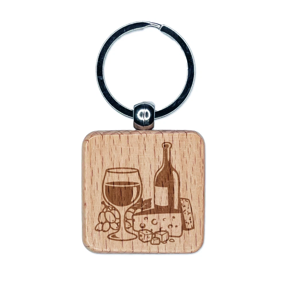 Wine and Cheese Engraved Wood Square Keychain Tag Charm