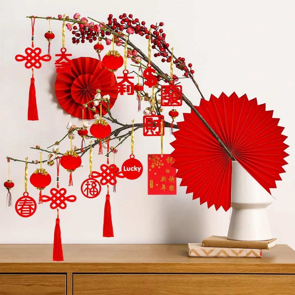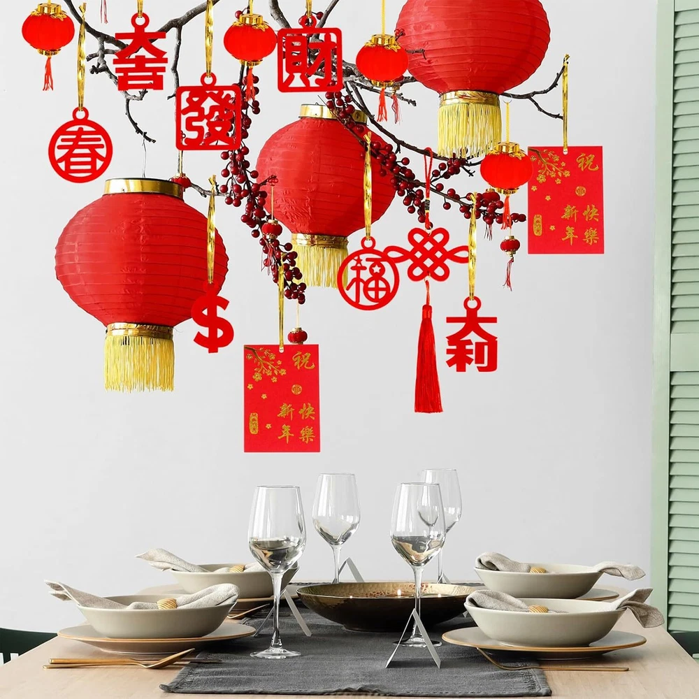 Winlyn 106 Pcs Chinese New Year Decorations Chinese Hanging Good Luck Ornaments Red Lanterns Festive Tree Ornaments Paper Fans for Asian Chinese Lunar New Year 2025 Year of The Snake Party Decor Product Details Package Dimensions: 9.72 x 8.35 x 2.32 inches Item Weight: 1.6 ounces Manufacturer: Winlyn 106 Pcs Chinese New Year Decorations Kit: 6 Decorative Hanging Chinese Red Lanterns, 10 Chinese Characters Red Ornaments Printed with Chinese Lunar New Year Blessing, 72 double-sided felt red Chinese New Year ornaments with gold, colorful glitter, and red tassels symbolizing blessings and good fortune, 4 Felt Chinese Knots Tassel Ornaments, 2 Red Paper Fans, 12 golden Chinese New Year ornaments with red tassels representing wealth, prosperity, and good luck, 80 Gold Metallic Twist Ties. Dimensions(LxW)(inch): Chinese Spring Festival Blessing Ornaments measures appr. 4.5" x 3.1". Sizes of Mini Chinese Lucky Felt Ornaments range from 2.8" to 13.4" in length and 1.7" to 2.7" in width. Red Lanterns measure appr. 6.7" x 2.1". Felt Chinese Knots Tassel is 3.9" wide and 12.2" long. Red Paper Fans measure appr. 15.7" in diameter. Gold Metallic Twist Ties are appr. 7.9" long. Color: Red is the dominant hue of the New Year. This traditional Chinese New Year decor set is red, accented with gold. The colors red and gold both symbolize wealth, prosperity and good fortune. The Spring Festival Paper Tags have been adorned with gold messages and blooming flowers, wishing for a Prosperous and Lucky New Year. Message on Mini Chinese Lucky Felt Ornaments wishes each person good luck in the new year. Material: Paper, felt, polyester, plastic material, metallic and flocking Material. Each Ornament has a hanging loop for easy hanging.Flexible twist allows tie the ornaments in your need. Decorate your home in red with this ornament set to prepare for the year ahead.In the Spring Festival, it is a Wish for Wealth and Good Luck that hanging these red ornaments on the Trees, whether tabletop tree or big tree.Great for decorating your gift, tree, car, front door, window, wall, shelf, parlor, study, bedroom, living room, dining room, mall, restaurant, shop, office, apartment and more.It's a great addition to your Chinese New Year, Asian themed birthday party.