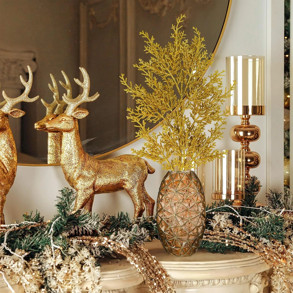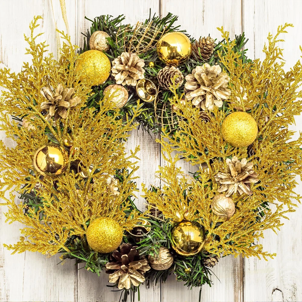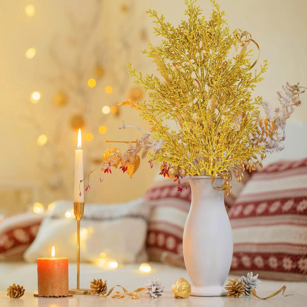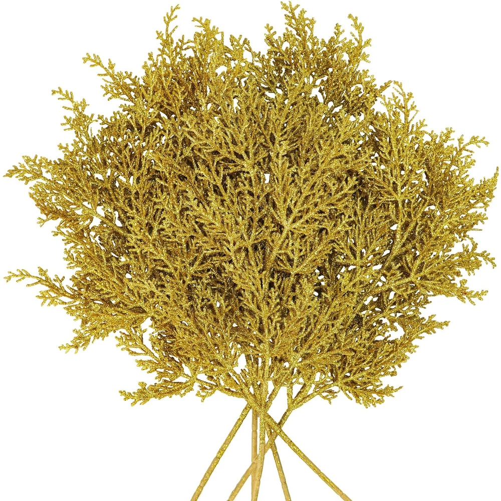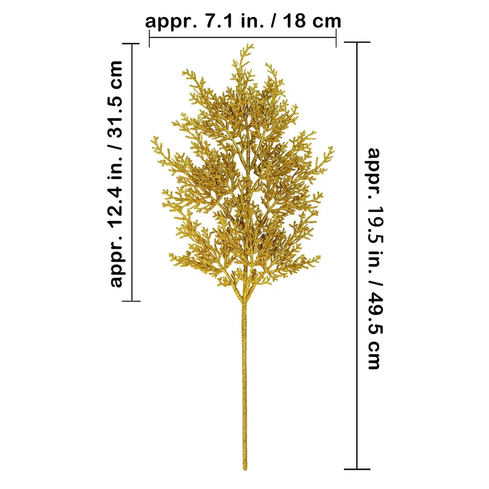Quantity: Package includes 6 pcs gold glitter artificial cedar picks. Each one has 9 branches and many sprigs, and looks more lush. With a flexible stem, they can be easily placed. You may use these glitter gold cedar stems in a clump or separate into individual stems for any holiday decorating project. They can be used for a variety of crafting and decorating endeavors. Add a modern and gorgeous element to your festive decorations and create a festive display in your home. Color: These gorgeous artificial cedar pine branches are bright gold. A central stem extends to take hold of diverging branches, which then branching off into smaller twigs, making for a realistic spray. The surface is covered with glitter powder, making them sparkly and eye-catching. Their golden look complements any themed holiday decoration. Great to use for your Christmas, weddings, winter parties, holidays, or any other special occasion that calls for a little sparkle! Size: Each gold Christmas tree pick measures about 19.5" tall and 7.1" wide, which is a perfect size for filling the Christmas tree, wreaths and garland. Their stems are also long enough to fit into vases, boxes, glass bottles, jars, pitchers, or other containers. You can adjust the stems to the width and length for you want. Make a Christmas centerpiece arrangement on any dining table, mantel, office desk, shelf, or any room in your home for a festive holiday look. Material: These faux cedar sprays are made of plastic and covered throughout with gold glitter. They look charming and shiny. And their plastic stems can be folded and bent at will, so they can be adjusted according to your decorating needs. These beautiful shiny glitter Christmas flower picks will always add sparkle to your holiday decorations. They are durable and will not break easily, can be reused, and will provide long-lasting beauty for years to come. Create a sparkling winter ambiance with our gold glitter cedar pine branches. Add some sparkle and texture to your Christmas tree, Christmas wreaths, garlands, and swags, Christmas centerpieces, seasonal floral arrangements, holiday table displays, winter wedding bouquets, wedding flower decorations, or embellish holiday gift wrap. They will sparkle anywhere in your home. Display them on your shelf, mantel, dining table, kitchen countertop, and more for a beautiful look.