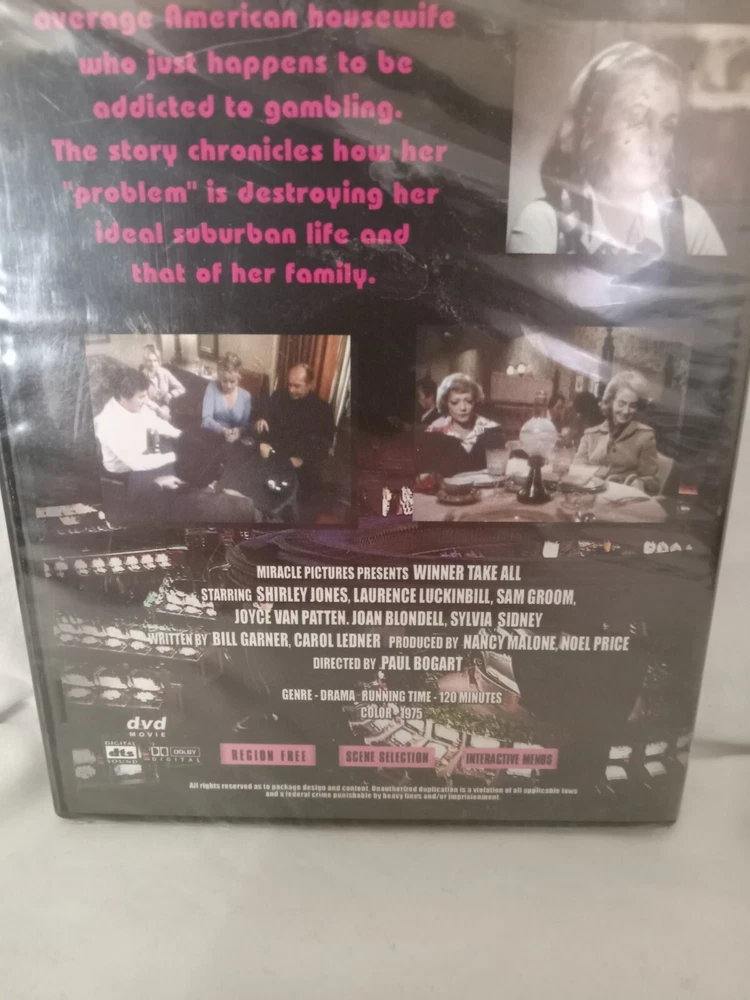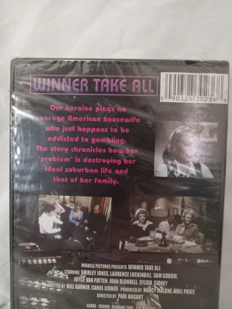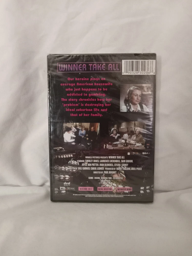 Franchise: na Edition: Full Screen Former Rental: No Country/Region of Manufacture: United States Movie/TV Title: Winner Take All Features: Coleo Rating: NR gtin13: 090328302368 Director: Paul Bogart Case Type: Jewel Case: Standard UPC: 090328302368 Actor: Shirley Jones Sub-Genre: Gambling Music Artist: na Genre: Drama MPN: n/a Studio: Miracle Pictures Release Year: 1975 Format: DVD Season: n/a Running Time‫: 120 Minutes Region Code: DVD: 0/All Type: Movie Language: American English, English