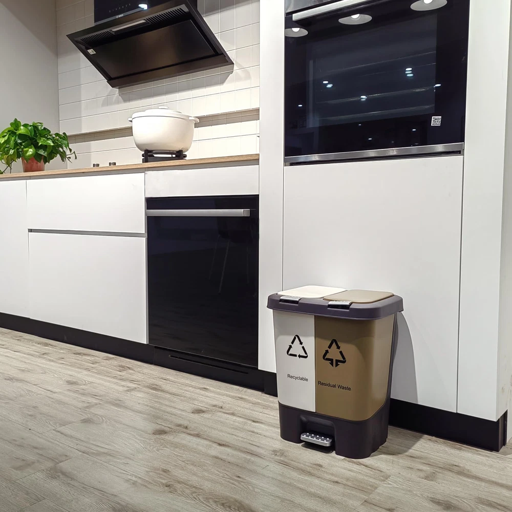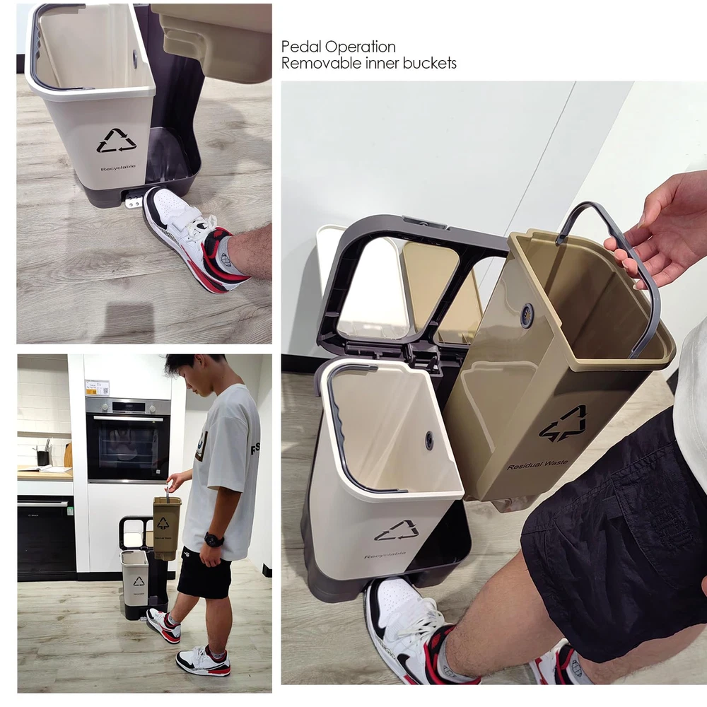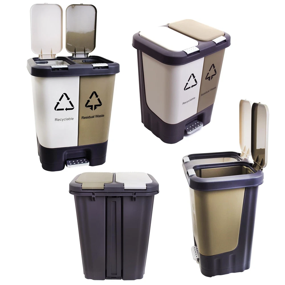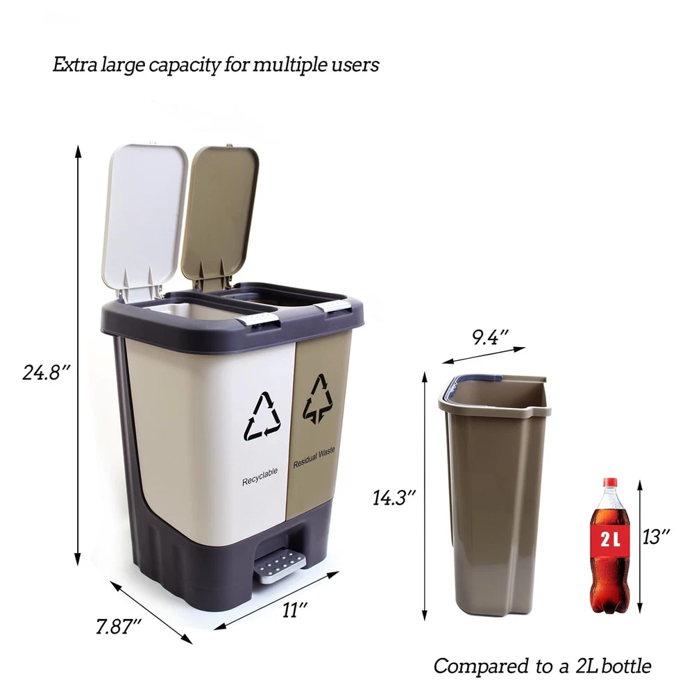 Dual Compartments: Separate sections for trash and recycling, making it easy to sort waste.The two compartments, one for trash and one for recyclables. Pedal Operation: Hands-free opening with a sturdy pedal, keeping the lid closed when not in use. it's practical functionality ensures a clutter-free environment Suitable for Multiple Rooms: Compact size (approx. 15 x 10 x 25 inches) fits kitchens, bathrooms, offices, etc.,this bin is suitable for various rooms, including the kitchen, bathroom, laundry room, bedroom, living room, and dining room. Its sleek design complements any decor, while its practical functionality ensures a clutter-free environment. Easy to Clean: Removable inner buckets allow for convenient emptying and cleaning.Dual Removable Liners for Recycling and Trash,Super convenient to clean out if needed. Construction: Made of sturdy plastic with a rust-resistant coating for long-lasting use.