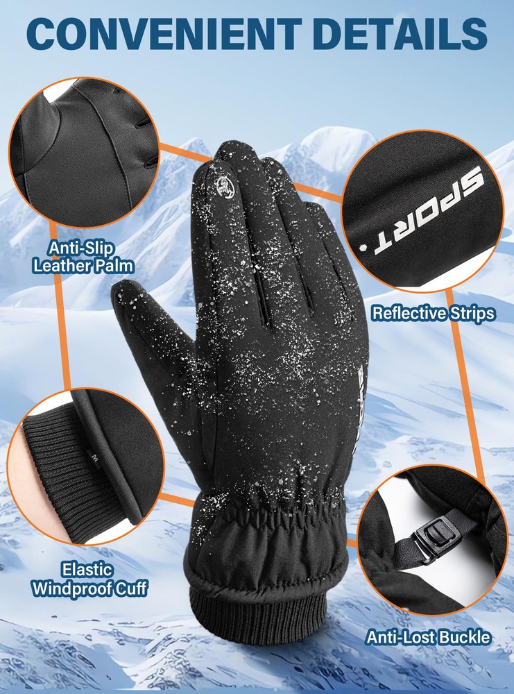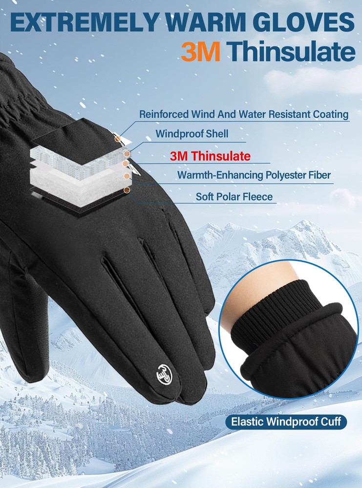 3M THINSULATE: Winter gloves are made of high-quality 3M cotton, which can lock in heat and keep it warm. The windproof shell and extended windproof cuffs can prevent cold wind from entering and protect your fingers from the interference of cold weather WATER REPELLENT: We designed a fine weave on the back of the hand to form a water-repellent shell, which can effectively block the intrusion of water and can meet the use of outdoor activities in rainy and snowy weather, and keep the warmth inside at all times. But be careful not to put the gloves into the water EXCELLENT TOUCH SCREEN: The leather material of the palm part not only gives the gloves a good grip, but also allows the gloves to have a five-finger touch screen performance, so you can use electronic devices anytime and anywhere without taking off the gloves COMFORTABLE LINING: The lining of the gloves is mixed with delicate thermal insulation materials and 3M cotton, so that the gloves can ensure warmth while ensuring comfort, allowing you to enjoy every moment of wearing gloves GOOD WINTER PARTNER: winter warm gloves have both performance and classic appearance, suitable for skiing, snowboarding, cycling, running, hiking, motorcycle riding and other outdoor activities, and can also meet daily wear, can meet your needs in different scenarios