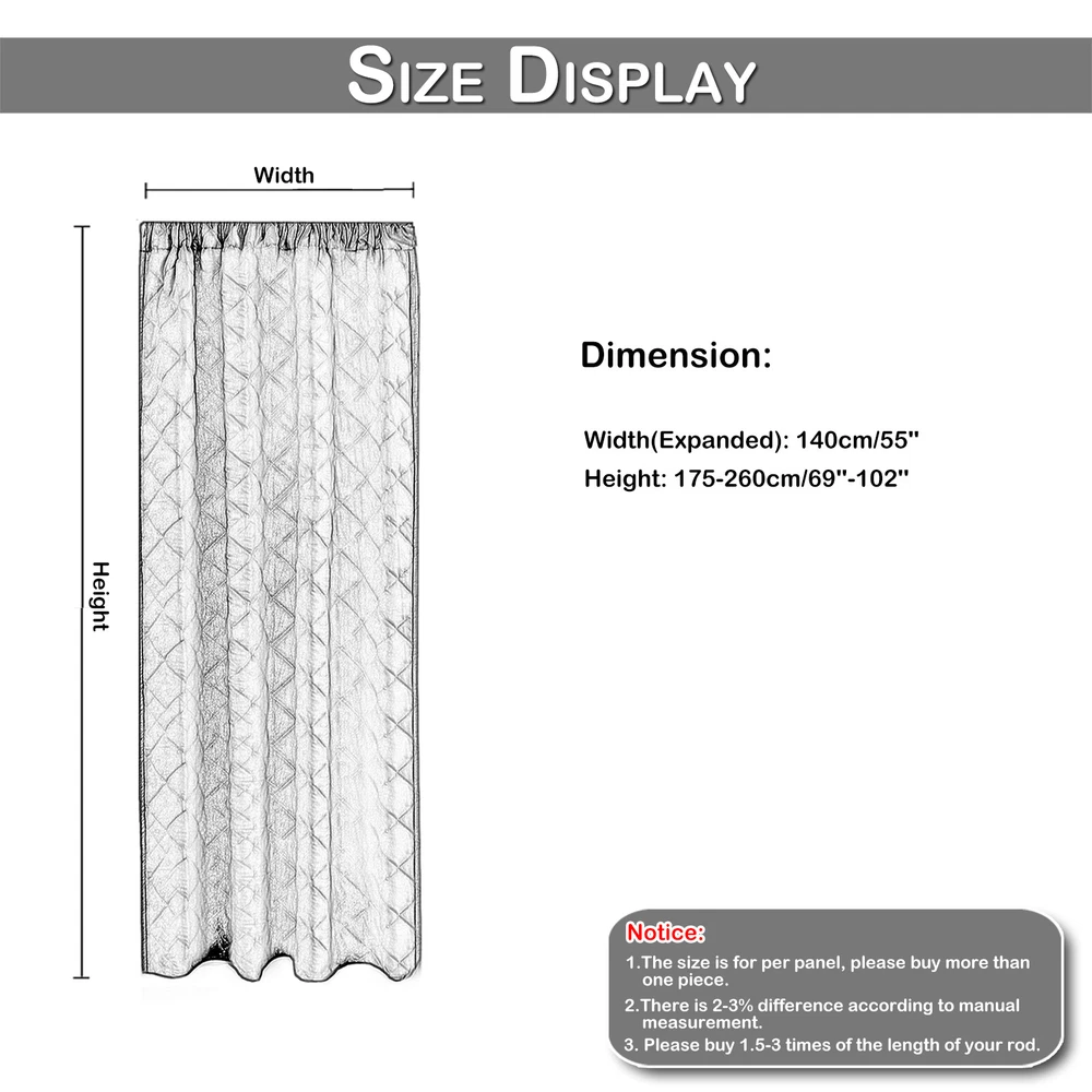 You may also like 1/2 Panels Blackout Winter Curtains Heavy Duty Thicked Drapes Isolate Cold Sound 41.49 USD Free shipping 1pc Waterproof Sofa Seat Cushion Covers Furniture Protector with Elastic Bottom 12.89 USD Free shipping 1/2 Panels Quilted Heavy Window Curtains Blackout Drapes Thermal Cold Heat Sound 44.19 USD Free shipping Large Room Divider Curtains Privacy Wall Door Drapes Waterproof Window with Hook 69.79 USD Free shipping Outdoor Screen Mesh Mosquito Net Patio Bug Insect Enclosure DIY Size White/Black 9.99 USD Free shipping Waterproof Door Curtain Self-Adhesive Solid Thermal Insulated Wind Drapes Winter 39.79 USD Free shipping Product Description 1/2 Panels Quilted Heavy Duty Window Curtain Liner Functional Solid Light Heat Sound Cold Blocking Curtain Door Curtain Panel Living Room Bedroom Winter Summer Home Textile(2 Colors) Description Features 2 Colors; 55''*69''/55''*86''/55''*96''/55''*102''/W*H for each panel ; Functional Heading ; Tieback(random color) for free. Curtain Liner--- Light Blocking Energy Saver. Thermal insulated. Help your curtain keep the heat and cold out. Heavy Duty--- Made of 100% Polyester Fiber Fabric, 280gsm quilted fabric. Block cold air in winter, and cool air in summer. Privacy Protection--- Keep your private place with these curtains. Block stray or unwanted light, and keep noise. Various Hanging Options--- functional heading includes rod pocket, back tap, clip rings, pleat hooks, shower hooks, and pin hooks, the curtain can be widely used for all types of window treatments. Notice: the accessories are not included. Easy Care--- Machine washable, and Line dry. Easy installation, easily disassembled. How to Choose--- Curtain total widths should typically be about 1.5 to 3 times the final width measurement of your window. Please notice the size and decide how many curtains you need for your house. Product Information About the Curtain Type: Quilted Curtain Liner Material: Polyester Blending Color: 2 Colors for your choice Size: 140x175cm/ 55''*69''; 140x220cm/ 55''*86''; 140x245cm/ 55''*96''; 140x260cm/ 55''*102'' Package: pe bag Package Include d Curtain*1/2 panel Tieback*1/2(Free) Notice 1. There is a 2-3% difference according to manual measurement. Please check the measurement chart carefully before you buy the item. 2. Please note that a slight color difference should be acceptable due to the lights and screens. 3. We recommend you buy 1.5-2 times the length of your rod. Payment Shipping Returns Contact Us Paypal. We only ship to confirmed paypal address. Items are generally dispatched within 1~3 business days after payment is cleared. Please make sure your address in Paypal is matched with your shipping address before you pay. We offer a 30 days return guarantee. If you are not satisfied with the item, you can return it within 30 days after item received. If items have any problem due to quality, please contact us for refund, exchange or a replacement. Please contact us first before item returned. Customer Service from 9:00 am - 6:00 pm on Business Days. Payment Paypal. We only ship to confirmed paypal address. Shipping Items are generally dispatched within 1~3 business days after payment is cleared. Please make sure your address in Paypal is matched with your shipping address before you pay. Returns We offer a 30 days return guarantee. If you are not satisfied with the item, you can return it within 30 days after item received. If items have any problem due to quality, please contact us for refund, exchange or a replacement. Please contact us first before item returned. Contact Us Customer Service from 9:00 am - 6:00 pm on Business Days. powered by