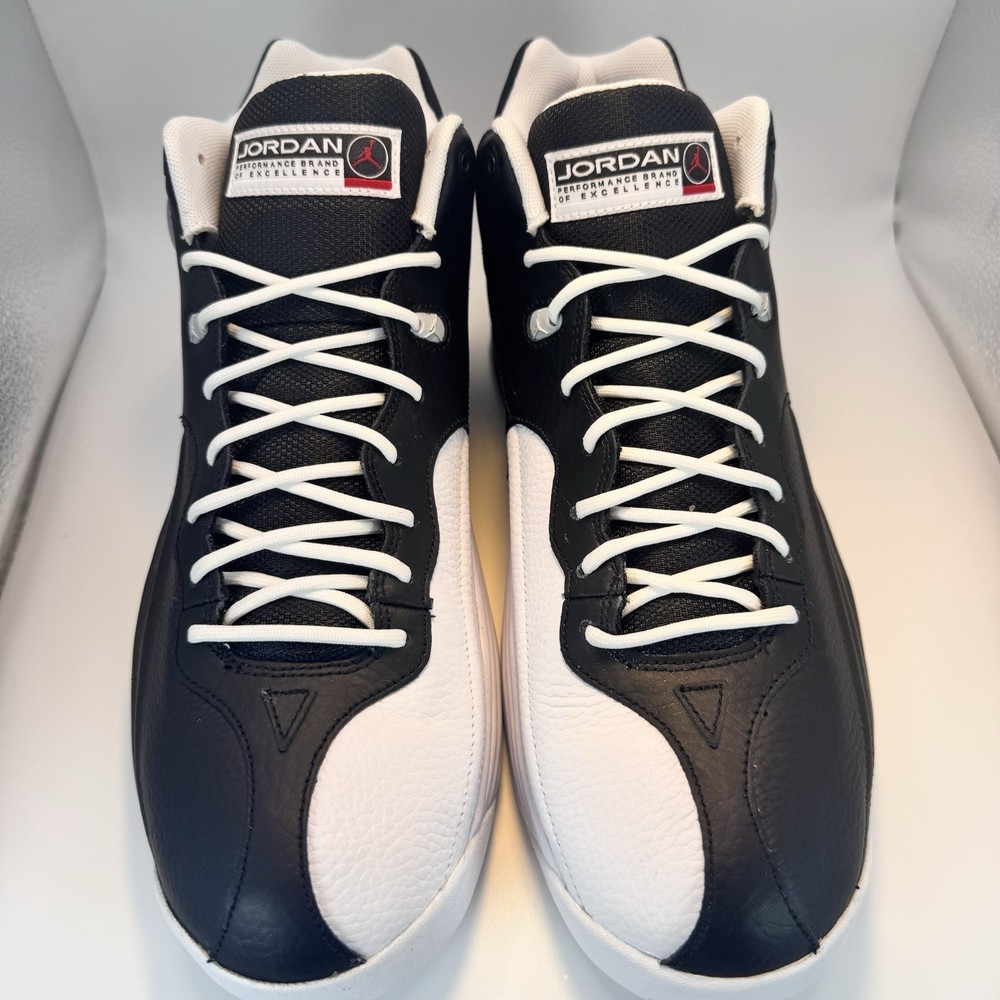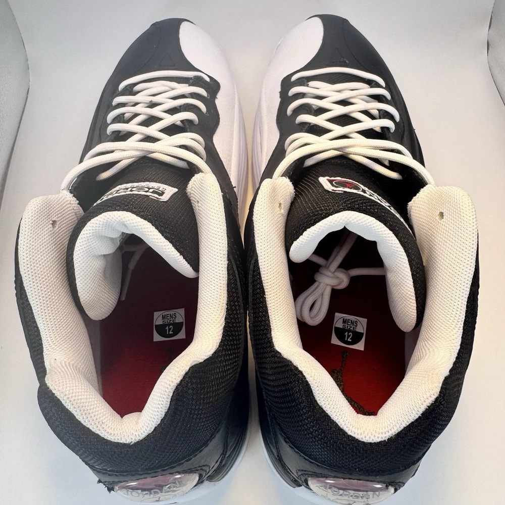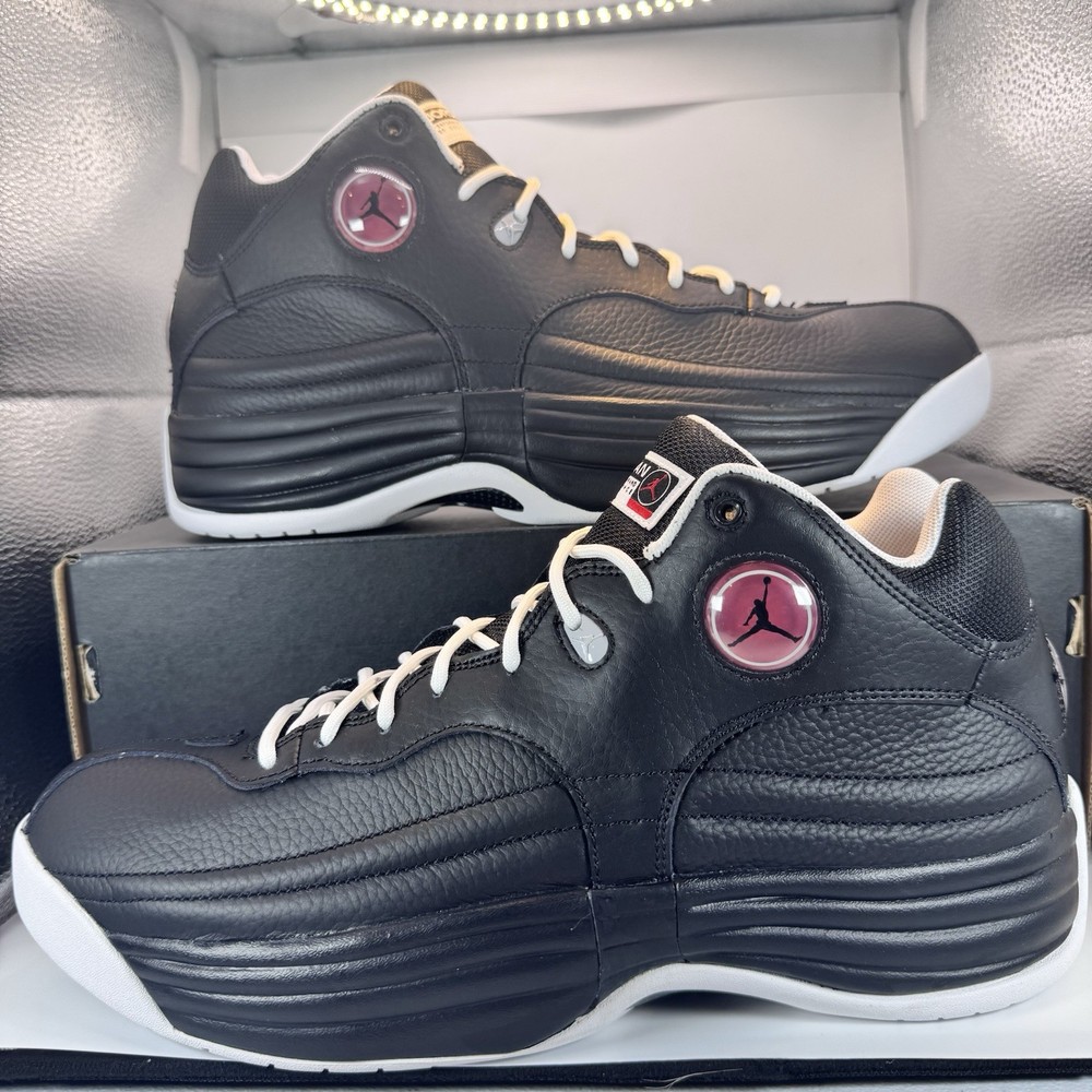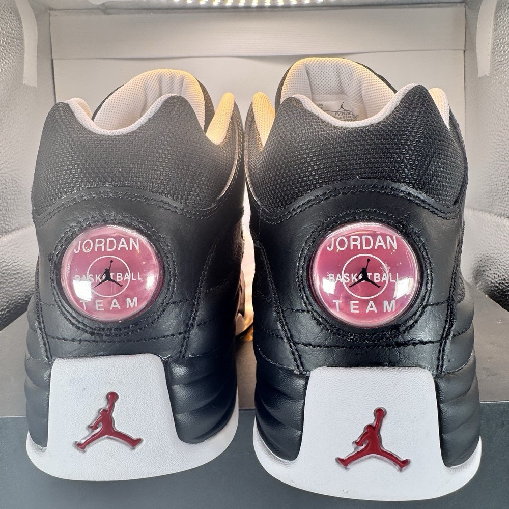 Price just reduced! Crafted from full leather, the shoe boasts mesh elements in tongues, collars, and lining. A Black base dominates, complemented by White touches on the inner side, laces, liner, and rubber sole. Vibrant Varsity Red accents adorn branded areas, adding flair. The enduring design is rounded out by trademark tongue labels and circular jeweled bubbles on the sides and heels. Brand new with box. Never worn or tried on.
