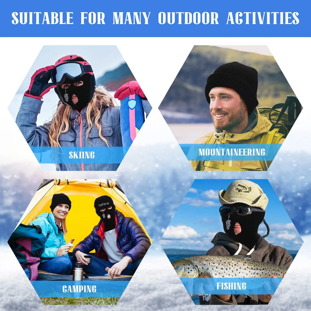 Comfortable Fabric to Serve You: each balaclava ski mask is made of acrylic yarn material, breathable and soft, lightweight and reliable, comfortable to touch, not break or fade easily, bringing you a pleasant wearing experience One Size to Fit Most: the balaclava face mask is in proper size which can fit most people, like women and men; It is stretchy, so it can fit your head circumference; You can carry it with you easily because it does not take up too much space 3 Hole Design: the ski mask for women is designed with 3 hole style; It can cover your head fully to keep you warm, with 3 hole design, you can breathe easily; It is convenient for you to see something with your eyes and eat something with your mouth, flexible and practical Wide Range of Application: the balaclava winter ski mask is not only suitable for daily wear, like going to offices and so on, it is also suitable for outdoor activities such as skiing, mountaineering, camping, hunting and more Practical Gifts: the full face knit mask is suitable for you to send to your friends, family members, relatives, lovers and other people on Christmas, Halloween, Thanksgiving and more, showing your sincere care to them