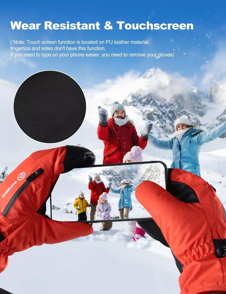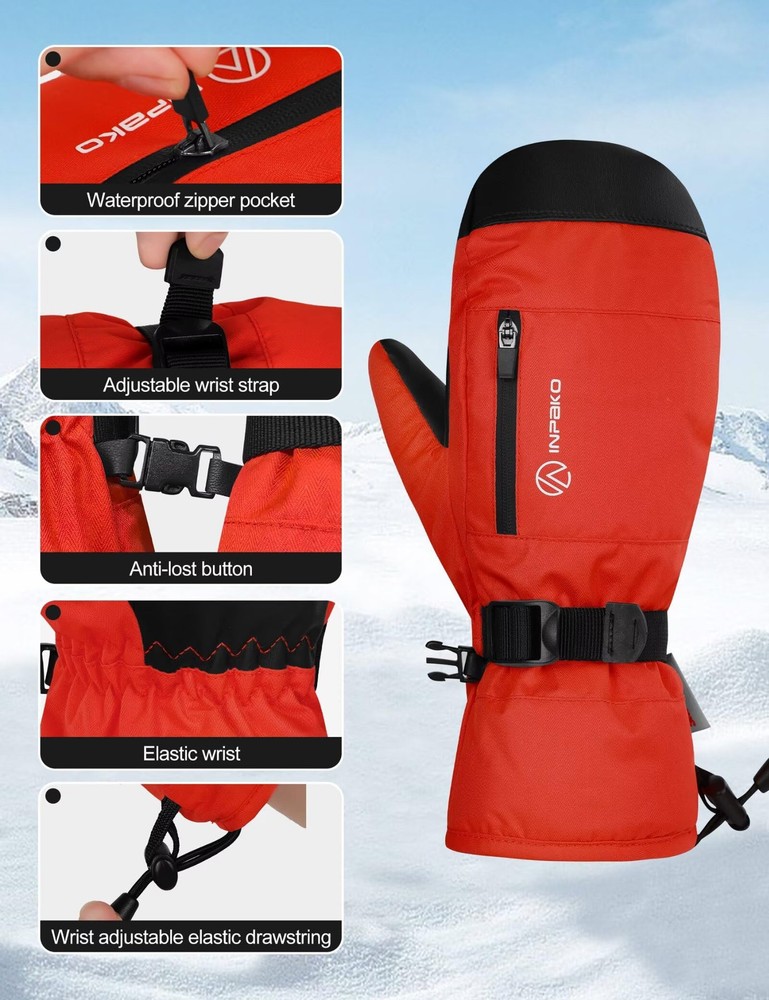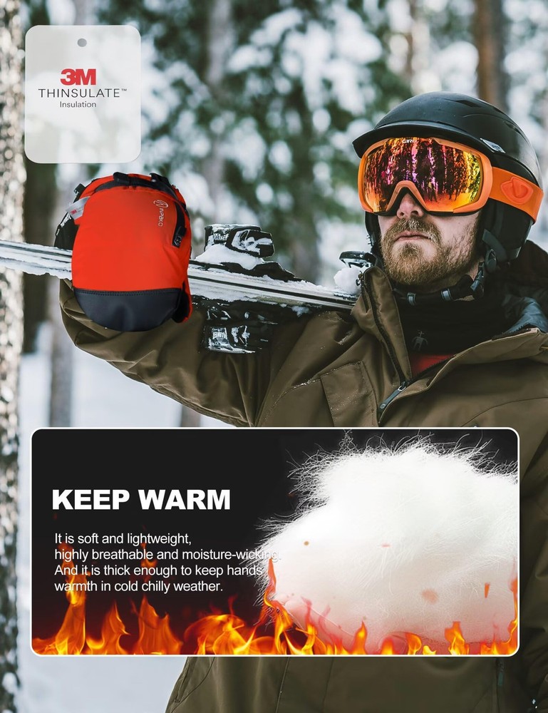 ✅【Gloves Inside Mittens】 The inner lining of the mittens is glove-shaped, it has five finger grooves, and each finger is separated inside the mittens in a way that prevents sweaty hands and keeps your hands warm and dry while being more flexible. ✅【3M Th-insulate Insulation】 These ski mittens are insulated with warm and lightweight 3m material, This material is lightweight and can effectively retain heat, preventing heat loss, thus providing efficient thermal properties, this snow winter gloves can keep hands warmth in cold chilly weather in skiing, snowboarding, winter riding, hiking and other snow sports. ✅【Waterproof & Windproof & Breathable】 This winter ski glove is made of 5-layer soft- shell material. Built-in TPU waterproof film and wind film to protect your hands for use in an ice cellar or any extreme winter environment. Maximum cold resistance temperature -10°F. Leather palm for touch screen and non-slip. ✅【More Details】 1. The adjustable wrist strap on the palm of the snowboard gloves can protect against the cold outside air, but also can be adjusted to a comfortable level of elasticity. 2. The waterproof zipper pocket designed on the back of the hand can be used to store credit cards and other small items, so it is easy for you to access. 3. The anti-lost button on the side allows you to find the ski glove easily. 4. The elasticized design on the wrist makes it more comfortable for you to wear. ✅【Multiple Applications】 The snow mittens are suitable for most winter sports such as skiing, snowboarding, snowmobiling, ice fishing ,shoveling snow, make a snowman, riding, cycling, motorcycle. It can also be worn for daily warmth in winter, which is a good gift choice for him/her.