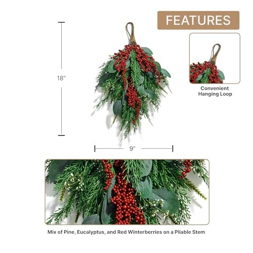 Return Policy Fast Delivery Trusted seller Winter Swag for Front Door, 18 Inch Greenery with Eucalyptus and Red Berry, Teardrop Swag for Decorating, Outdoor Winter Hanging Decor, Rustic Seasonal Front Door Accent Product Description PERFECT WINTER DECOR – Elevate your home with this artificial winter swag featuring a realistic mix of cypress and eucalyptus greenery, topped with red and white berry accents for a classic look. | Dimensions: 18" x 12" x 3". CHRISTMAS DECOR - Red and green Christmas colors fit into any decor style, from traditional to modern farmhouse. Pair with matching wreath and lighted garland for a complete decor set. EASY TO USE - The end of the front door swag branch is formed into a handy loop. With this easy-to-hang botanical, you can add a splash of holiday cheer to any room. USE IT ANYWHERE - Hang this winter door swag at the end of a banister, mantel, crown window dressing, or doorframe, or place it around any room to complement other winter elements. CARE TIPS - To ensure years of enjoyment, store the greenery in a dry location and avoid prolonged exposure to the elements. Shipping Returns Payment Shipping Shipping is FREE to all addresses other than APO/PO boxes in the lower 48 states. All our stock ships from US-based warehouses. Shipped via USPS or UPS (depending on location and package weight) Unless stated otherwise, all orders will ship within 24-72 hours of your payment being processed. Check our feedback to see the great reviews of FAST shipping we offer. Returns Seller does not accept returns Payment We currently accept payment via eBay managed payments only. Once payment is cleared, we will dispatch your shipment within 1-3 business days. Please refer to the "Shipping" tab for more information regarding shipping speed to your destination.