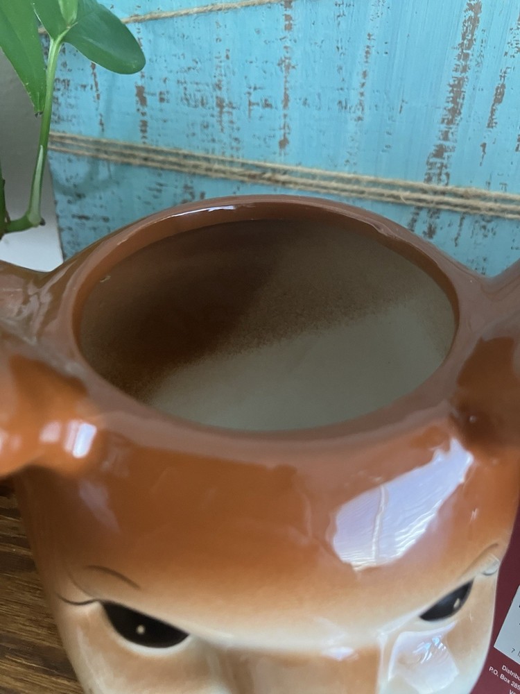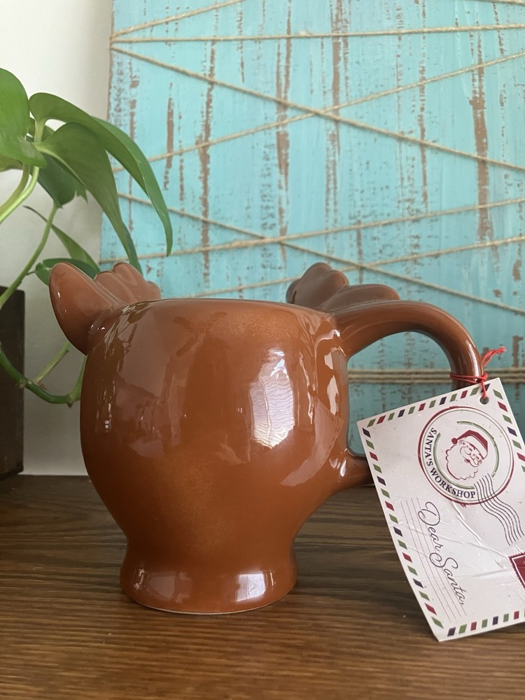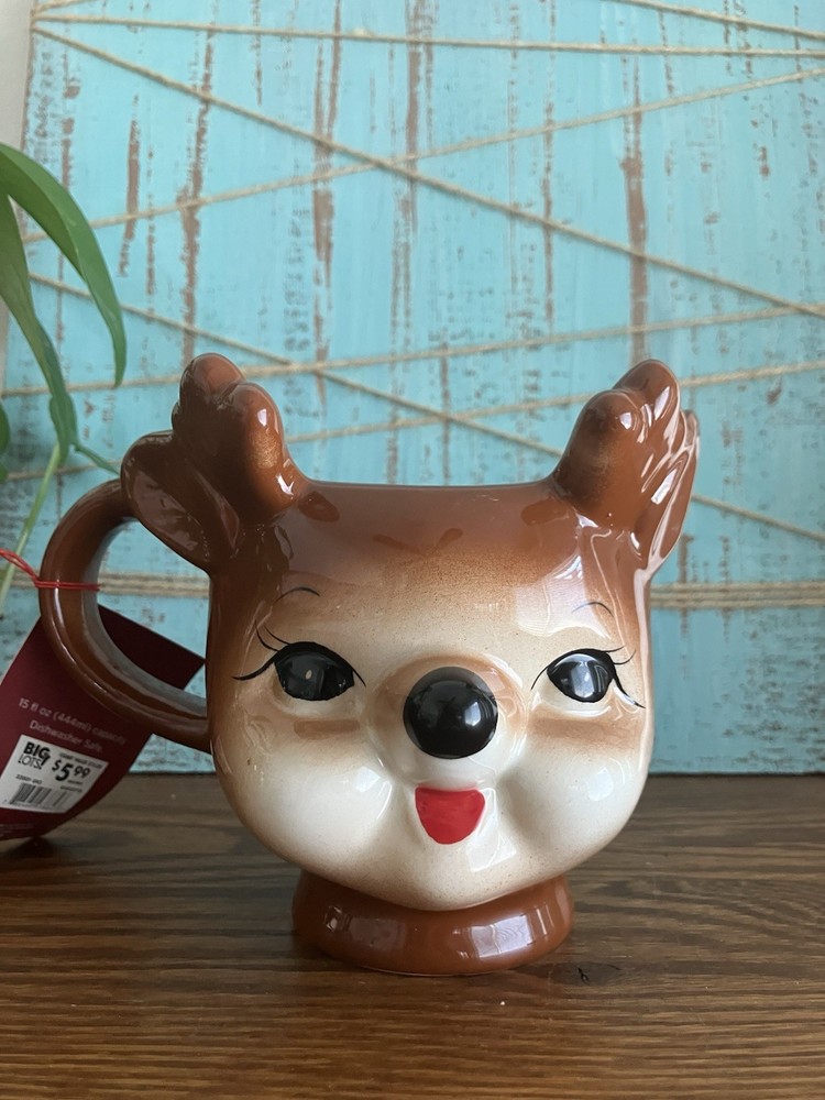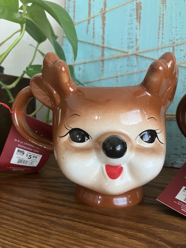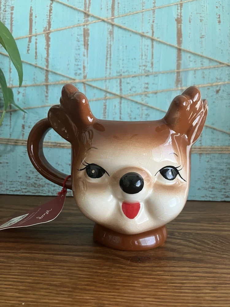 One mug has chip on right ear please see photos. Add some festive cheer to your winter mornings with this adorable set of 2 Reindeer Mugs from Read. These figural mugs are perfect for sipping your favorite hot beverage while enjoying the Christmas season. The beige color of the mugs is accented with cute reindeer antlers, making them a perfect addition to your holiday decor. These coffee mugs are ideal for those who love anthropomorphic kitsch and want to add some fun to their winter celebrations. Each mug in the set includes a unique design, making them a great gift for your loved ones or a lovely treat for yourself. Celebrate the season in style with these charming Winter Wonder Lane Reindeer Mugs.